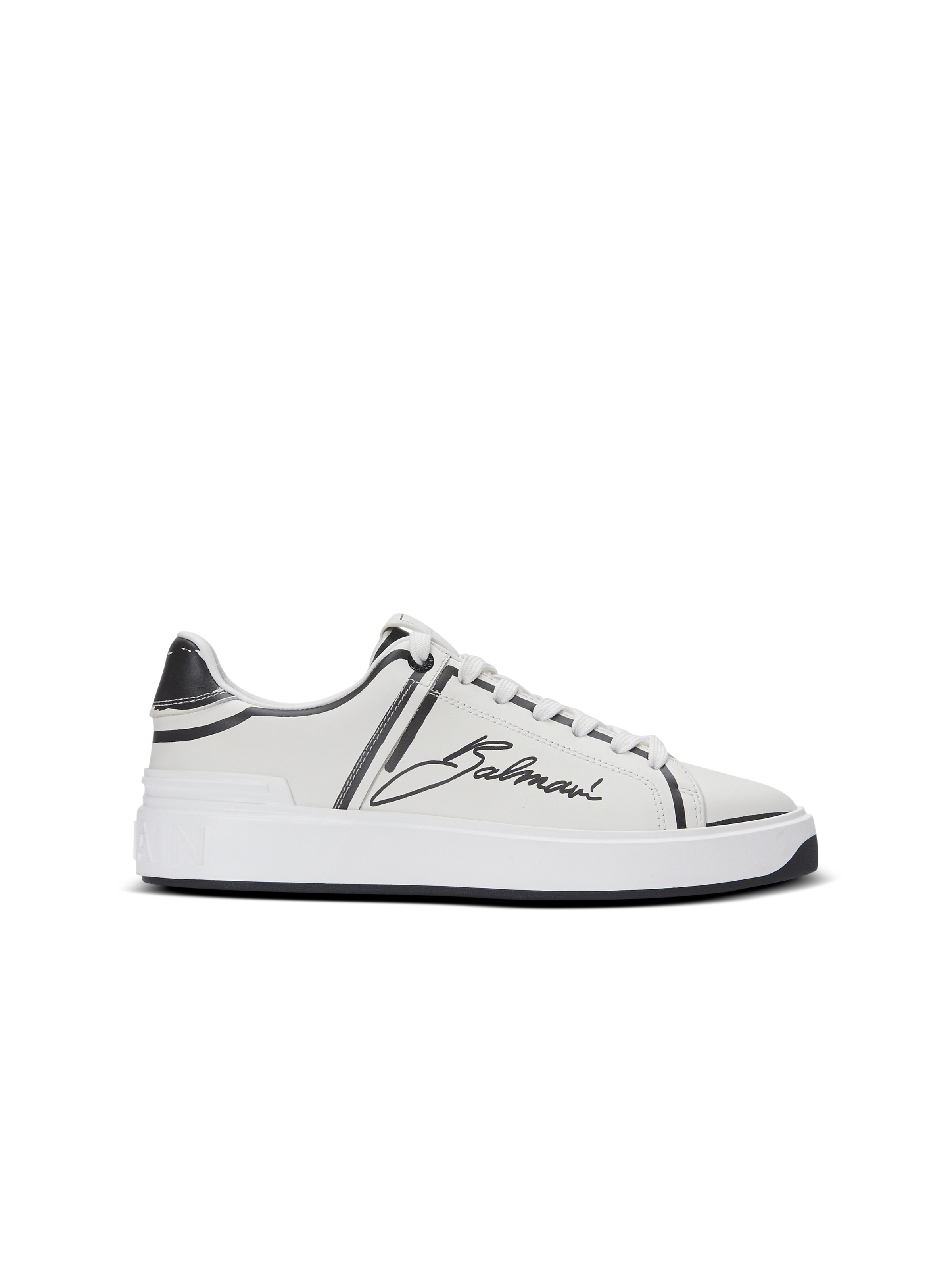B-Court trainers in Balmain-printed calfskin with a "Love Letter" motif - Lace fastening with engraved eyelets - Leather label with Balmain logo - Printed Balmain Letter logo on the side - "Je t'aime" inscription printed on the side - Thick rubber outsole with raised Balmain logo - Leather lining - Contrasting leather insole - Main material: 100% calfskin - Made in Italy - Item: EM1VI288LCLP