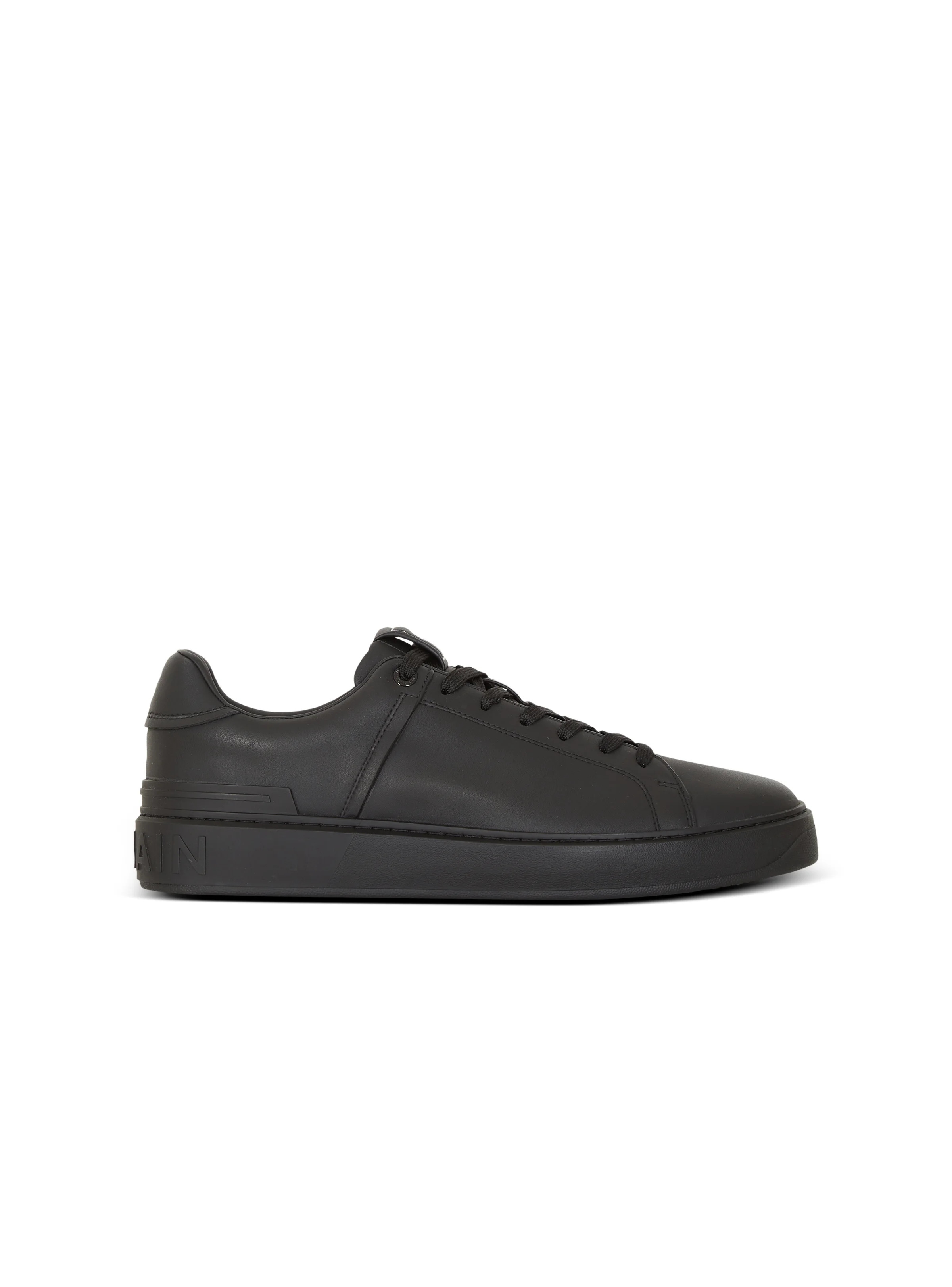 Calfskin B-Court trainers with PB tongue - Lace fastening with engraved eyelets - Leather label with contrasting Balmain Paris logo - B logo-embossed leather heel counter - Visible stitching - Thick rubber outsole, Balmain logo - Leather lining and insole - Main material: 100% calfskin - Made in Italy - Item: GM1VI288LVTR