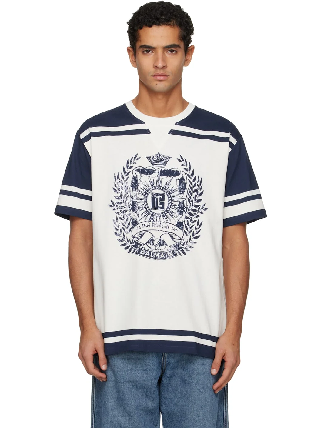 White & Navy Varsity 'Balmain' Écusson Print T-shirt