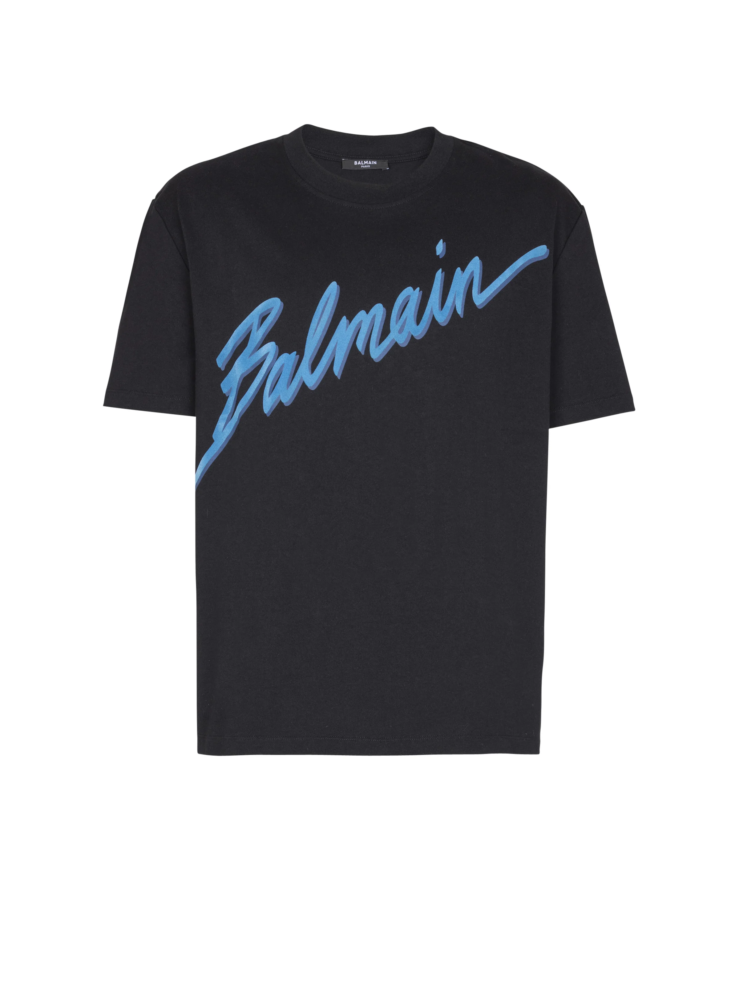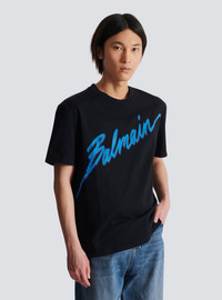 Balmain Lettre flocked T-shirt - Round neck with ribbed trim - Short sleeves - Contrasting flocked Balmain Lettre logo on the front - Regular fit - Model measures 190cm and wears a size M - Main material: 100% cotton - Made in Portugal - Item: EH2EG000BC86100% of the cotton fibres used to make this garment are certified and organically farmed