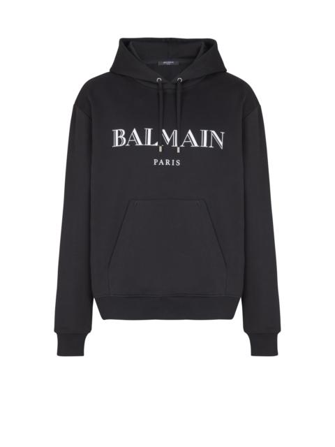 Balmain printed hoodie - Relaxed fit - Round neck - Drawstring hood - Long sleeves - Vintage Balmain logo printed on the front - Kangaroo pocket - Engraved silver aglets, eyelets and stoppers - Ribbed edging - Model measures 190cm and wears a size M - Main material: 100% cotton - Made in Portugal - Item: FH2JR090BD33