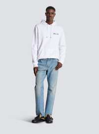 Balmain Signature hoodie - Relaxed fit - Round neck - Drawstring-adjustable hood - Long sleeves - Contrasting Balmain Signature embroidery on the front - Kangaroo pocket - Engraved silver aglets, eyelets and stoppers - Ribbed edging - Model measures 189cm and wears a size M - Main material: 100% cotton - Made in Portugal - Item: DH1JT047BC78100% of the cotton fibres used to make this garment are certified and organically farmed
