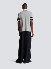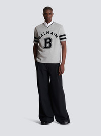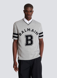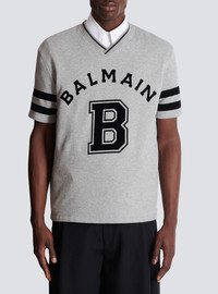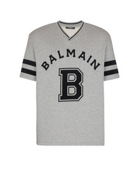 Cotton V-neck T-shirt - Short sleeves - Balmain Sport logo printed on the front - Ribbed edging with contrasting stripes on the neckline and contrasting flocked stripes on the sleeves - Regular fit - Model measures 190cm and wears a size M - Main material: 100% cotton - Made in Portugal - Item: FH0EG175BD13100% of the cotton fibres used to make this garment are certified and organically farmed