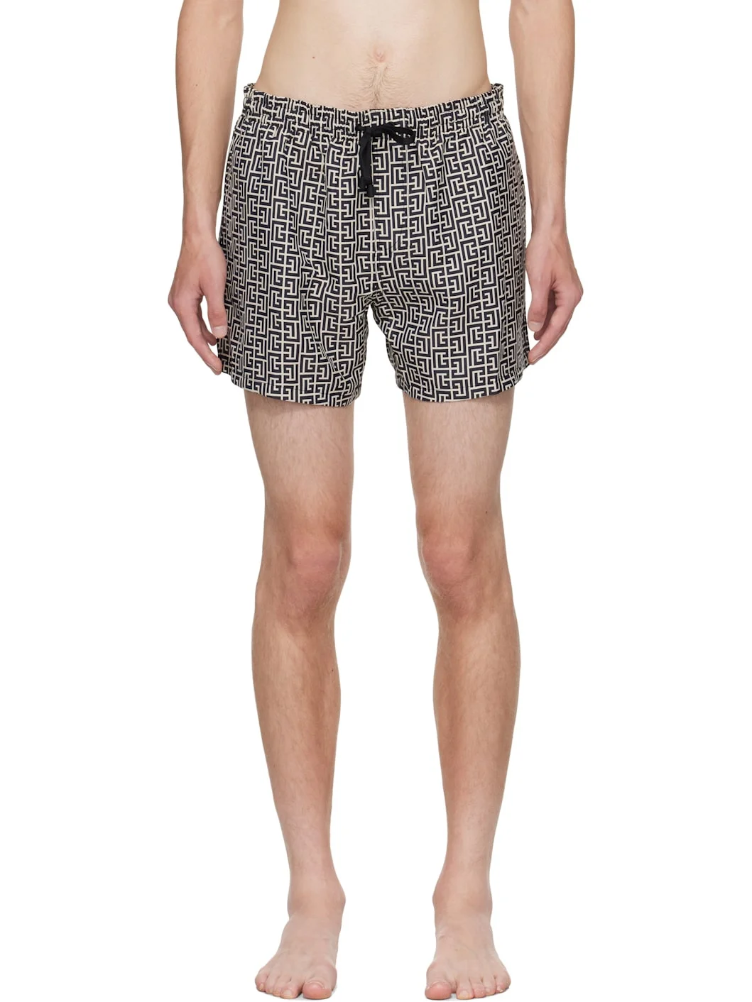 Stretch nylon twill swim shorts. · Jacquard logo graphic pattern throughout · Drawstring at elasticized waistband · Three-pocket styling · Grommets at back waist · Mesh brief-style lining Supplier color: Ivory/Black Body: 76% polyamide, 24% elastane. Lining: 100% polyester. Made in Italy 251251M208000