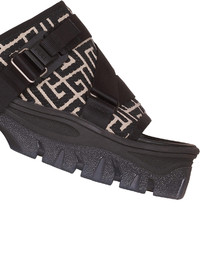 Monogram jacquard Ulysse mules Black straps on top with decorative buckle, thick sole, ivory and black Balmain monogram pattern Fits true to size: select your usual size. Made in Italy Materials: 84% Cotton, 16% Polyester Item: XM1UR295TJQM