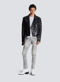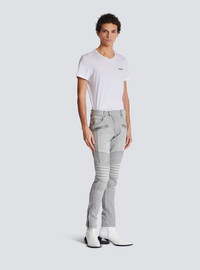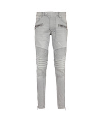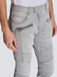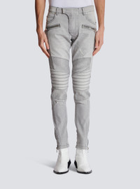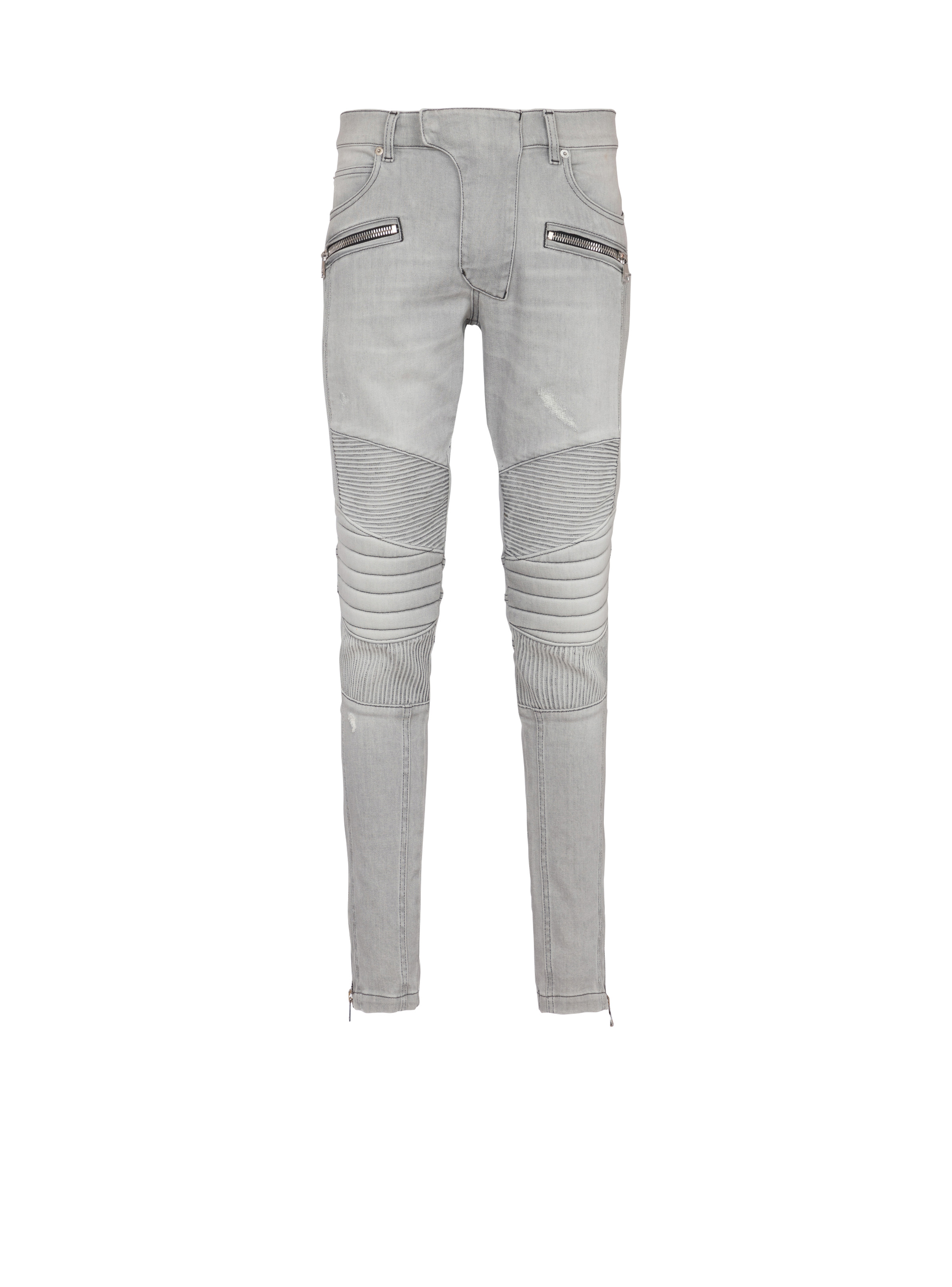 Biker jeans in Grey quilted denim - Slim leg - Fitted - Ribbed knees, thighs and back - Padded knees - 5 classic pockets, including 2 with visible zips on the back - 2 visible zip pockets on the front, Balmain Paris-engraved slider - Fly - Zip and press-stud fastening under a placket - Visible zip at the ankles, Balmain Paris-engraved slider - Engraved rivets - Waistband with belt loops and a triple belt loop at the back - Woven label with vintage Balmain logo - Silver hardware - Grey wash - Model measures 189cm and wears a size 30 - Main material: 100% cotton - Made in Italy - Item: DH1MG105DE69