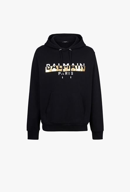 Black eco-designed cotton sweatshirt with white and gold Balmain Paris metallic logo print