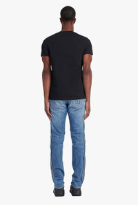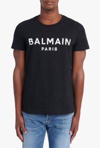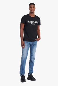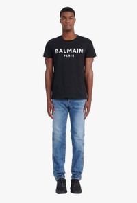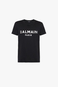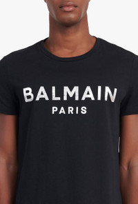 Black organically cultivated cotton T-shirt Short sleeves, crew neck, silver Balmain Paris logo print ITEM INFORMATION - Casual cut - Fits true to size, select your usual size - The model is wearing size M - The model's height is 186 cm / 6 ft 1 in, bust 93 cm / 36 in, waist 71 cm / 28 in, hips 89 cm / 35 in - Made in Portugal - Material: 100% Organically cultivated cotton - Item: XH1EF000BB29EAC