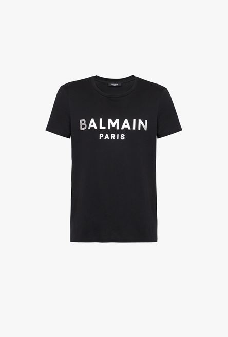Black eco-designed cotton T-shirt with silver Balmain Paris logo print