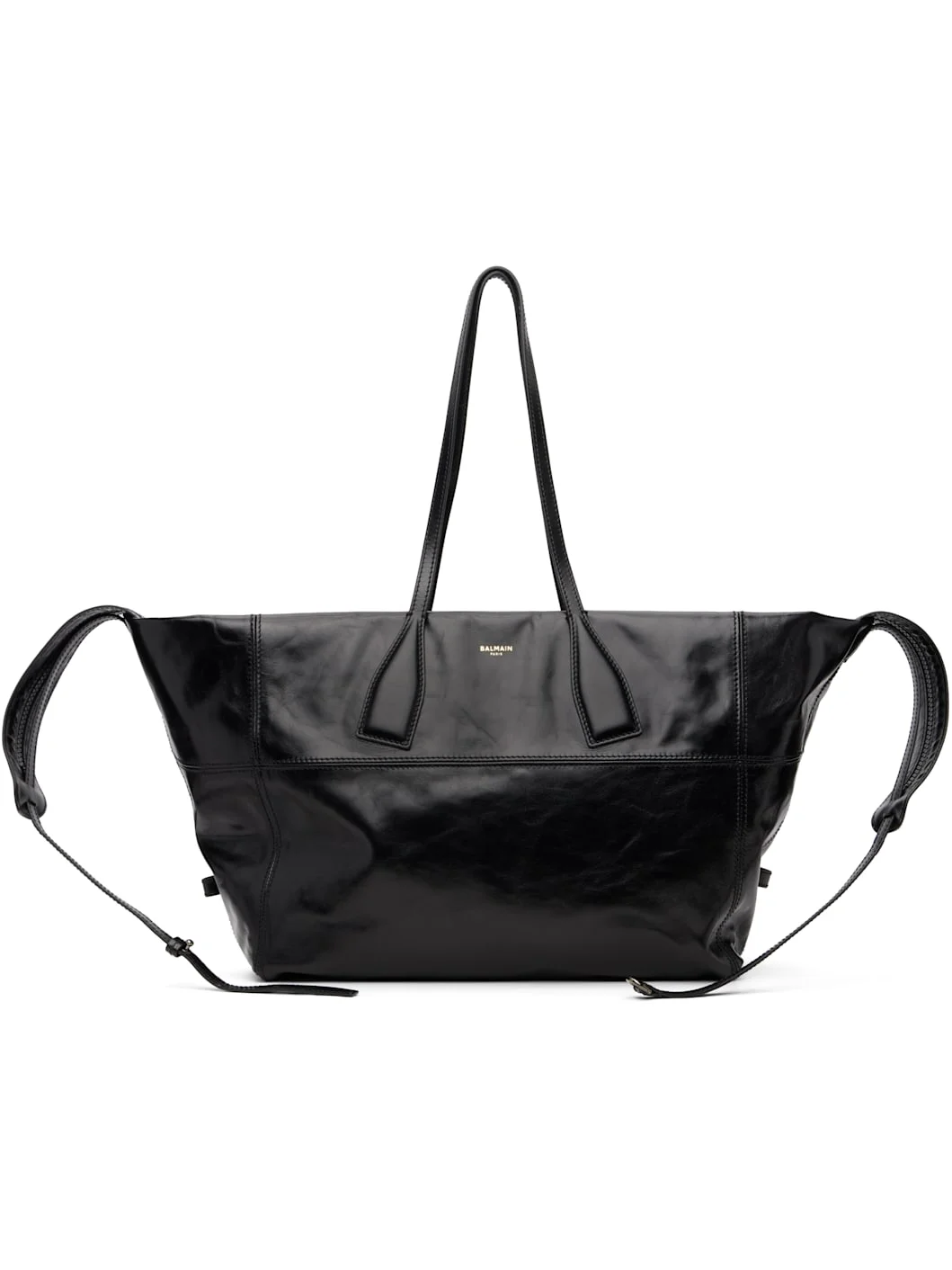 Crinkled polished calfskin tote. · Twin shoulder straps · Detachable crossbody strap · Logo stamp at face · Two-way zip closure · Card slot and patch pocket at interior · Cotton twill lining · H12" x W25" x D6" Supplier color: Black Body: 100% calfskin. Lining 1: 100% cotton. Lining 2: 100% calfskin. Made in Italy 252251M172001