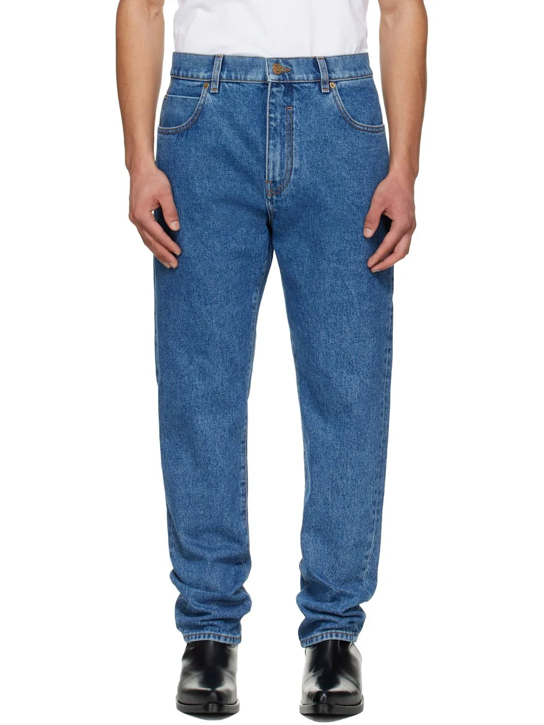 Non-stretch organic cotton denim jeans. · Fading throughout · Straight-leg · Belt loops · Five-pocket styling · Zip fly · Logo patch at back waistband · Logo embroidered at back pocket · Contrast stitching in tan Supplier color: Blue Body: 100% organic cotton. Trim: 65% polyester, 35% cotton. Made in Romania 261251M186007