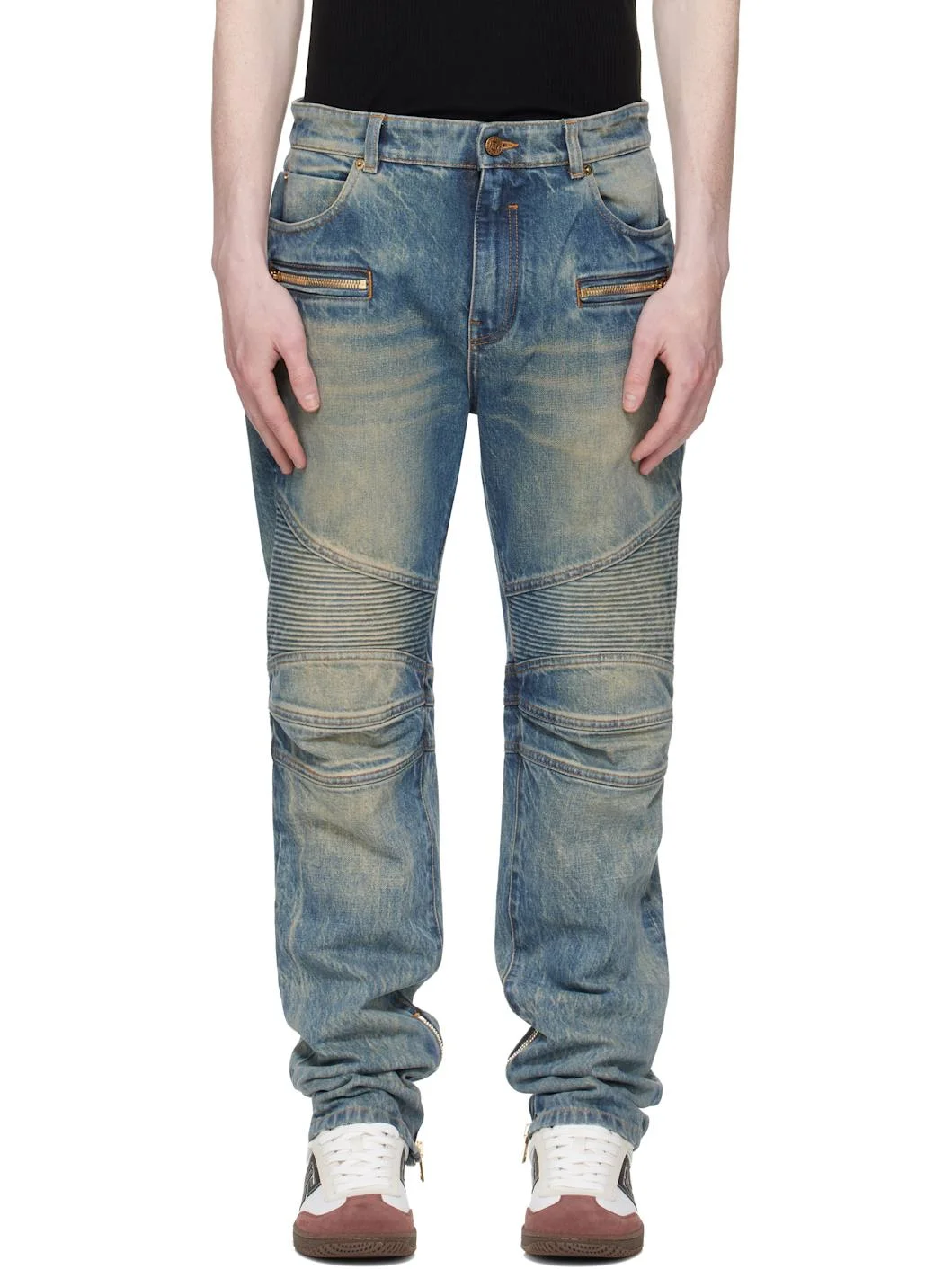 Non-stretch denim jeans. · Fading and whiskering throughout · Belt loops · Five-pocket styling · Zip fly · Zip pockets at front · Quilted detailing at knees · Zip vent at cuffs · Logo patch at back waistband · Logo embroidered at back pocket · Logo-engraved antiqued gold-tone hardware · Contrast stitching in tan Supplier color: Blue Body: 100% cotton. Pocket lining: 65% polyester, 35% cotton. Made in Italy 261251M186004