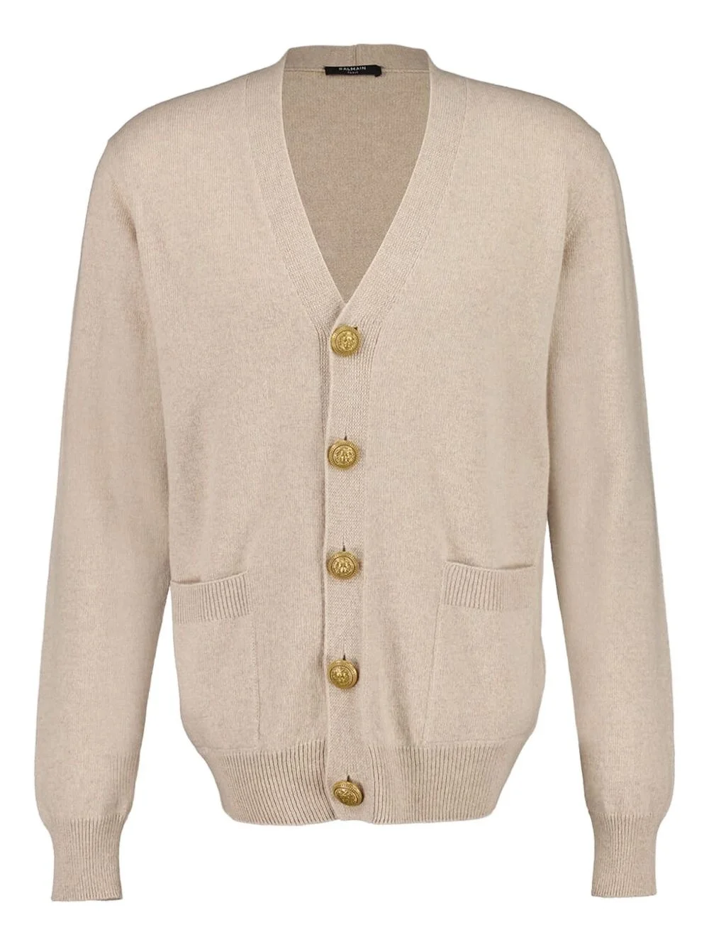 button-up cardigan Highlights - Beige - Front button fastening - V-neck - Long sleeves - Ribbed cuffs and hem - Side patch pockets Made in France Composition Cashmere 50%, Virgin Wool 50%