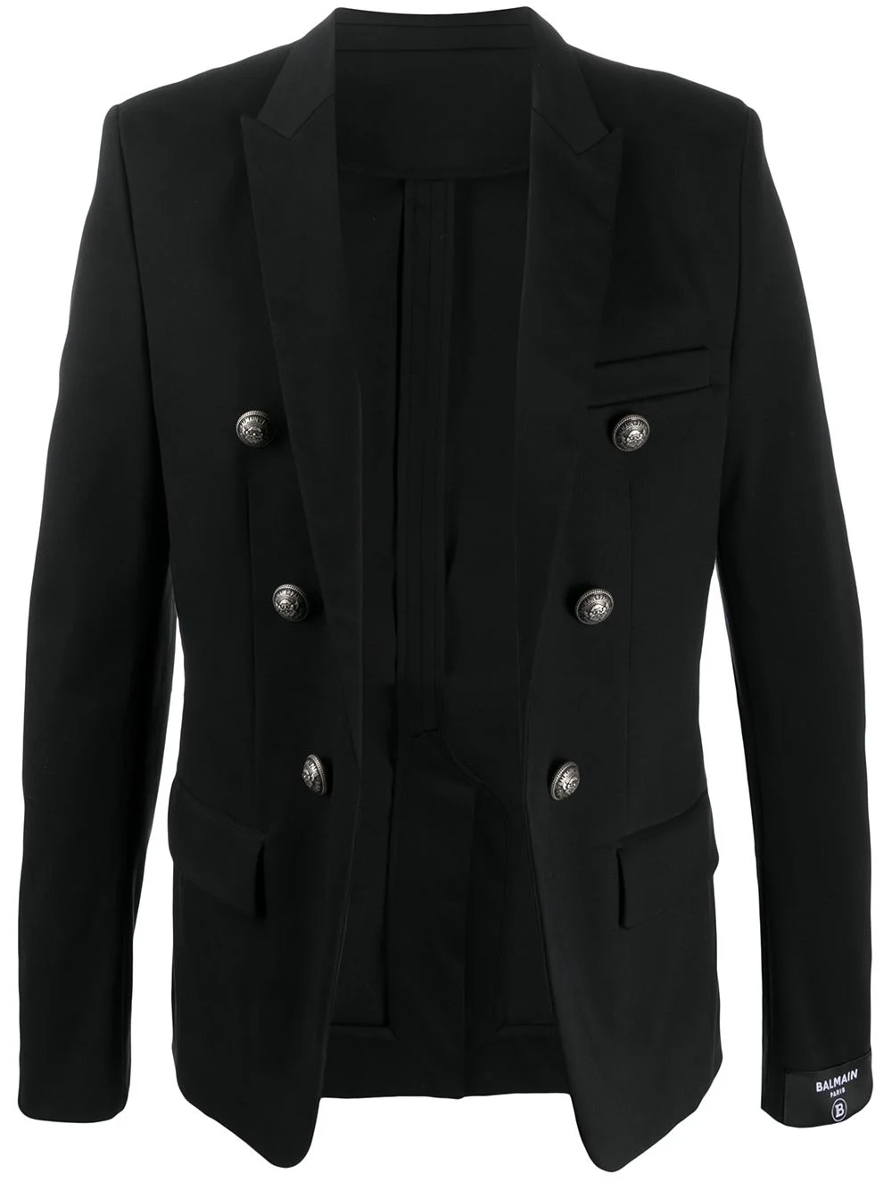 buttoned blazer Not cut for the military? Join the #BalmainArmy instead and start by wearing one of their iconic military style blazers such as this black cotton jacket detailed with the signature lion embossed buttons to the front. You'll be ready in soldier time. Highlights - Black - Cotton - Embossed silver-tone buttons - Peak lapels - Two side flap pockets - Long sleeves - Buttoned cuff sleeves Imported Composition Outer: Cotton 97%, Polyurethane 3% Lining: Viscose 52%, Cotton 48% SIZE & FIT Model measurements Height 6 ft 2 in(1.87 m) Bust/Chest 37.79 in(96 cm) Hips 37.79 in(96 cm) Waist 30.31 in(77 cm) Washing instructions Dry Clean Only