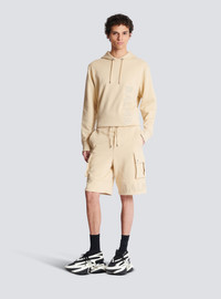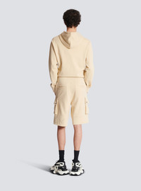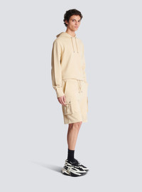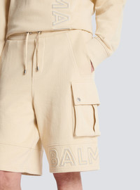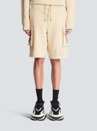 Cotton cargo shorts with reflective Balmain logo - Sporty fit - 4 pockets - Reflective technical debossed Balmain logo - Ribbed waist - Drawstring-adjustable waist - Silver metal eyelets, stoppers and aglets - Model measures 189cm and wears a size M - Material: 100% cotton - Made in Portugal - Item: BH0OA130BC22 100% of the cotton fibres used to make this garment are organically farmed and GOTS-certified