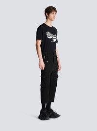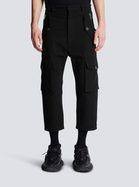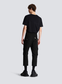 Thick cotton cargo trousers - Straight cut - Fastened with zip and invisible hook at the front - 2 gusseted pockets and 2 pockets with buttoned and zipped flaps - Vintage silver metal zip and buttons - Triple belt loop - Engraved metal Balmain mini plaque on the back - Model measures 187 cm and wears a size 48 - Material: 100% cotton - Made in Italy - Item: BH1PQ006CE25