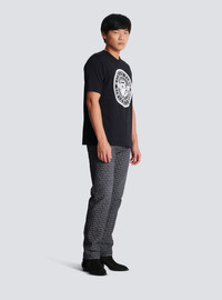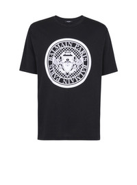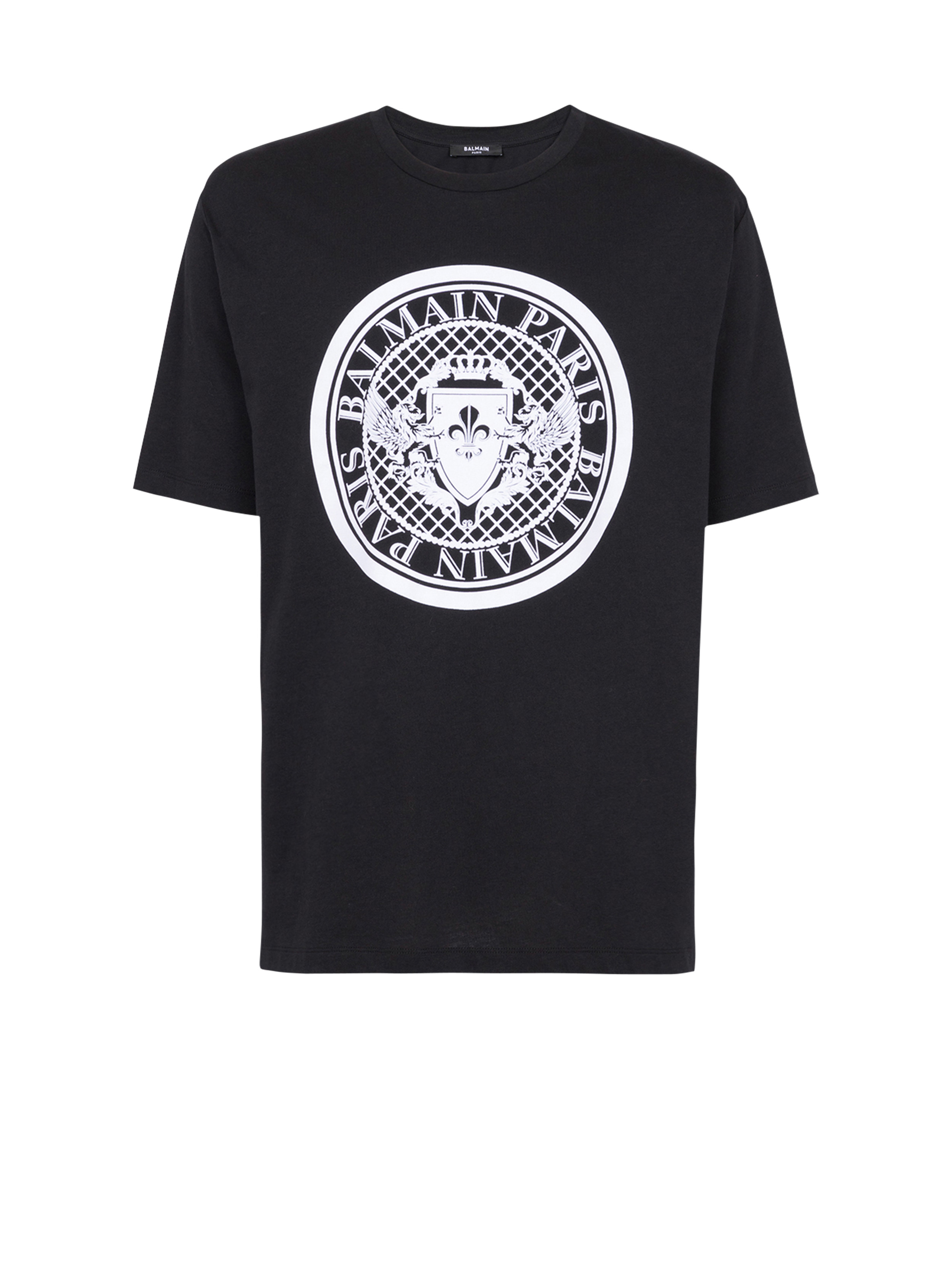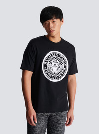 Flocked Coin T-shirt - Contrasting flocked Balmain Coin detail on the front - Straight cut - Round neckline - Short sleeves - Model measures 187cm and wears a size M - Material: 100% certified organic cotton - Made in Portugal - Item: BH1EG000BB17 100% of the cotton fibres used to make this garment are organically farmed and GOTS-certified