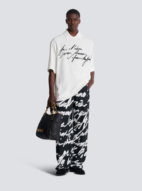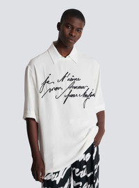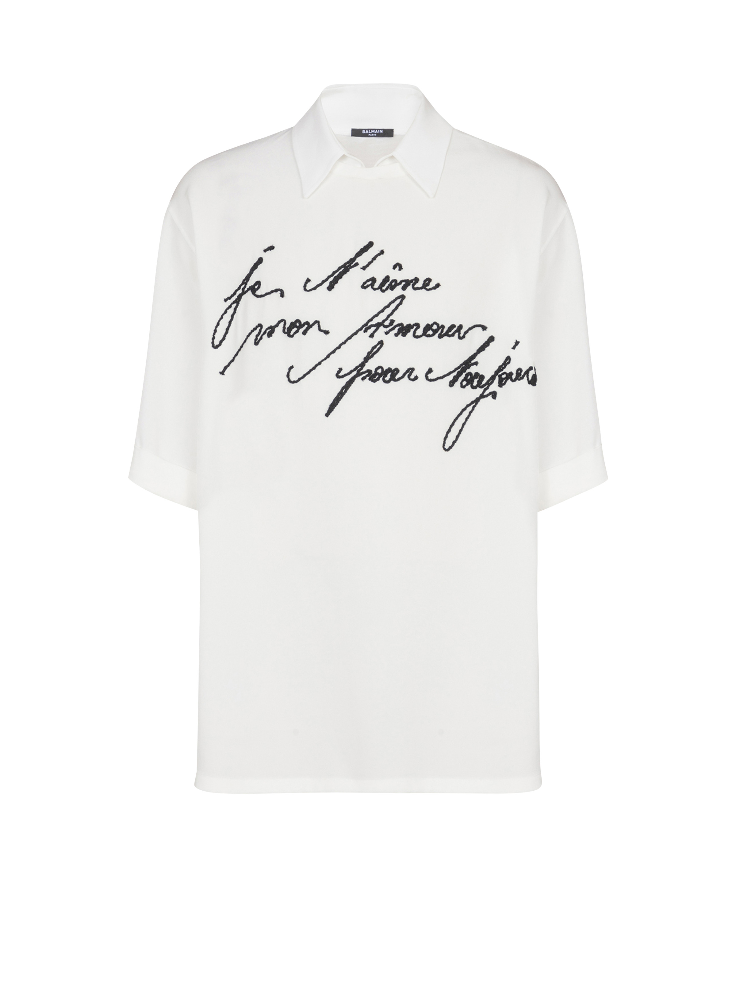 Crepe collared T-shirt with "Love Letter" embroidery - Shirt collar with hidden button - Round neckline - Short cuffed sleeves - "Love Letter" embroidery in contrasting textured thread on the front - Regular fit - Model measures 187cm and wears a size 48 - Main material: 100% viscose - Made in Italy - Item: EH1AM055VB00100% of the viscose fibres used to make this garment come from certified, sustainably managed forests
