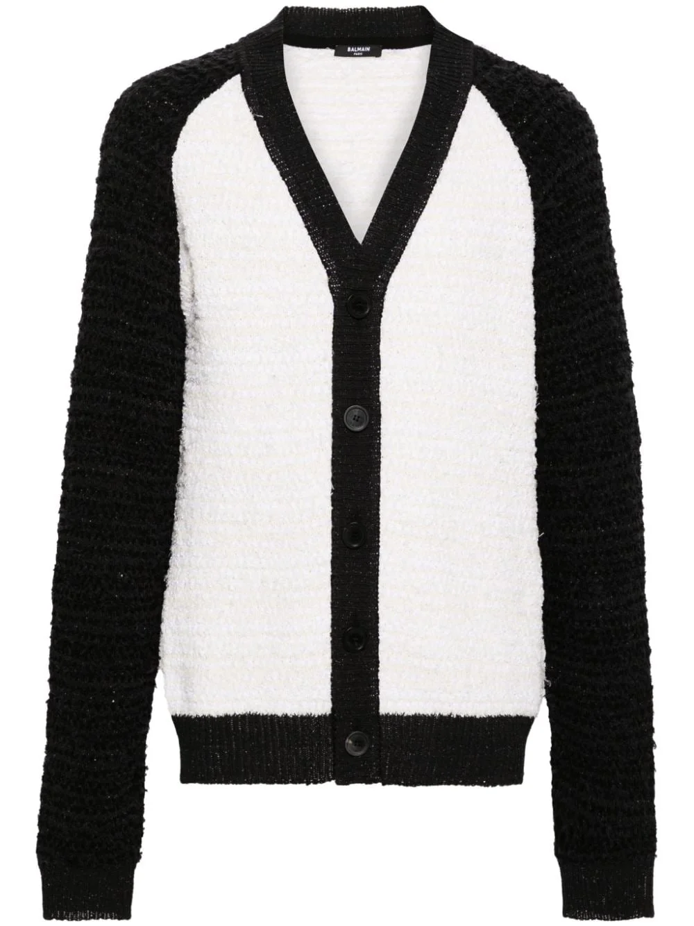 colour-block boucle cardigan Highlights - White/black - Cotton blend - Knitted construction - Boucle design - Colour-block panelled design - Ribbed v-neck - Front button fastening - Long sleeves - Ribbed cuffs and hem - Straight hem Made in France Composition Cotton 59%, Polyamide 31%, Linen/Flax 9%, Polyester 1% SIZE & FIT Model measurements Height 6 ft 2 in(1.88 m) Bust/Chest 36.61 in(93 cm) Hips 35.82 in(91 cm) Waist 27.95 in(71 cm) FittingInformation Designed to be unstructured, offering a loose fit throughout Made with a lightweight knit, this piece offers some stretch This piece fits true to size – take your usual size