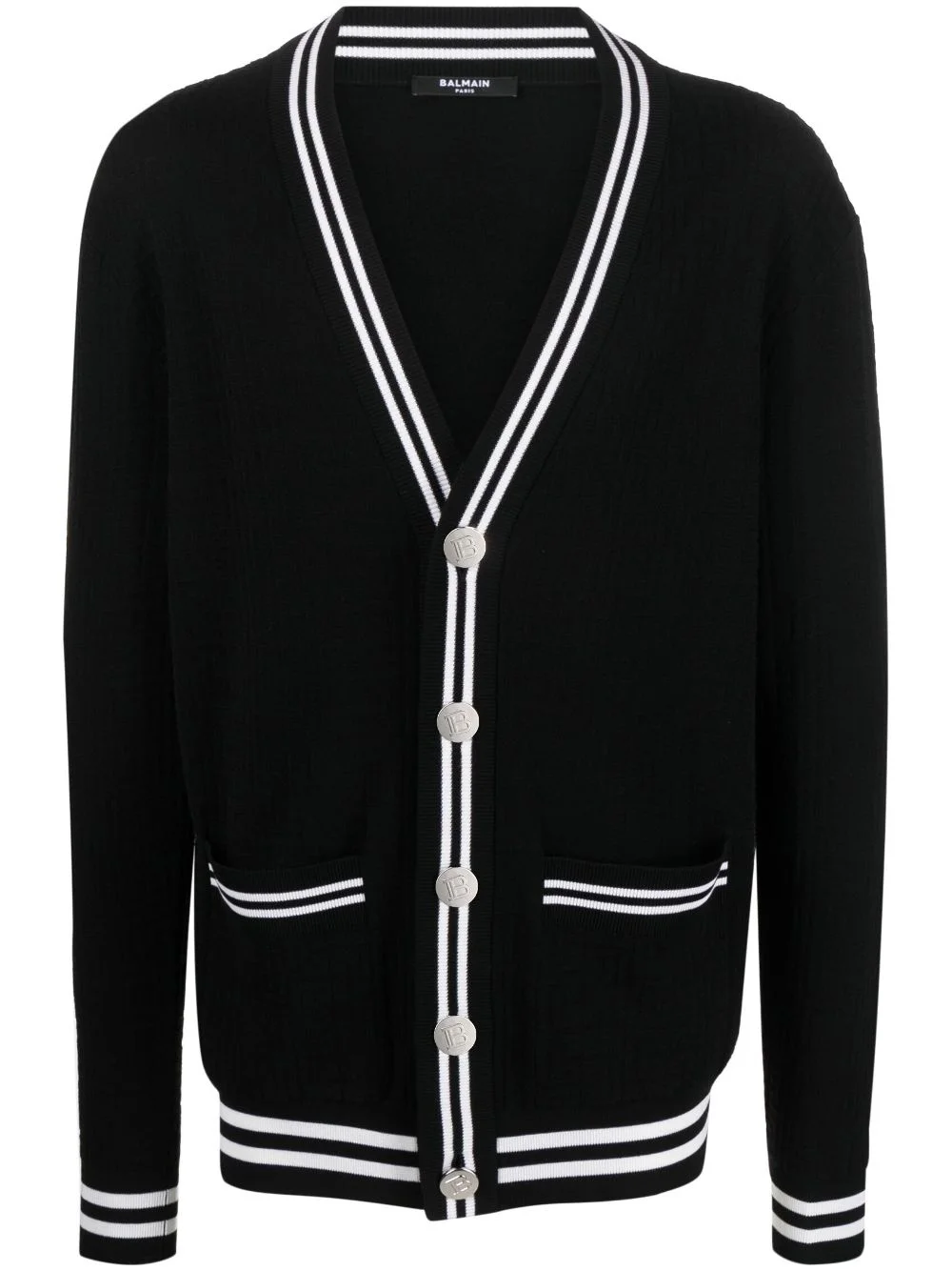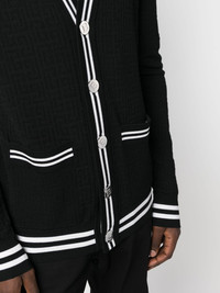 contrasting-trim V-neck cardigan Highlights - Black/white - Wool-virgin wool blend - Embossed silver-tone buttons - Stripe trim - Ribbed cuffs and hem - V-neck - Front button fastening - Long sleeves - Two front patch pockets - Straight hem Made in Italy Composition Wool 62%, Viscose 22%, Virgin Wool 9%, Polyamide 7% SIZE & FIT Model measurements Height 6 ft 2 in(1.89 m) Bust/Chest 39.76 in(101 cm) Hips 37.4 in(95 cm) Waist 29.92 in(76 cm) FittingInformation Designed for a relaxed fit, this piece allows for comfort and movement when worn The ribbed hem offers a close, comfortable fit Made with a midweight knit, this piece offers some stretch This piece fits true to size – take your usual size Washing instructions Dry Clean Only