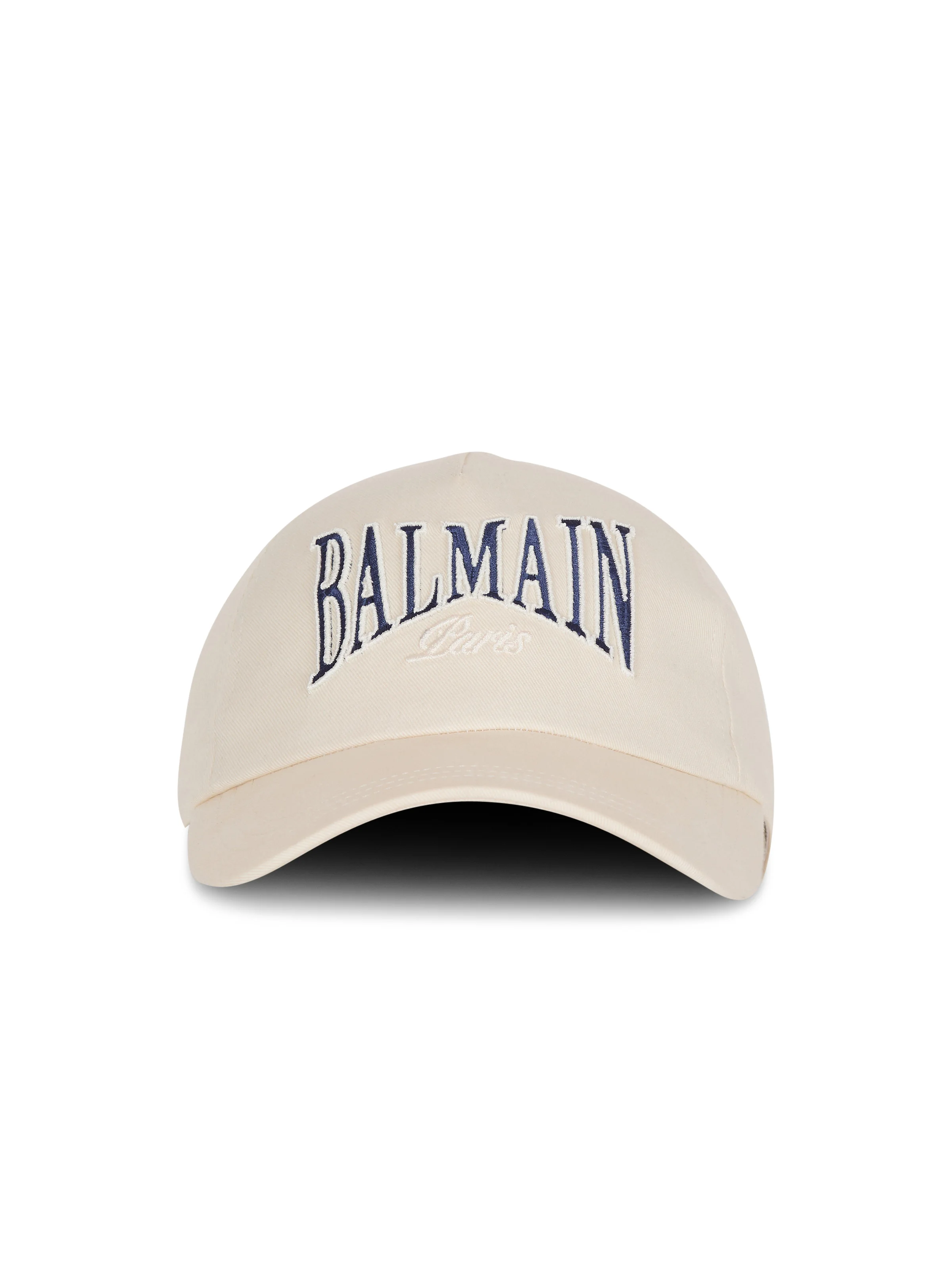 Cotton Balmain College cap - Contrasting Balmain Paris embroidery on the front - Adjustable back strap with engraved silver rectangular metal buckle - Topstitching - Relaxed vintage fit - Main material: 100% cotton - Made in Bulgaria - Item: FH0XA545CB24