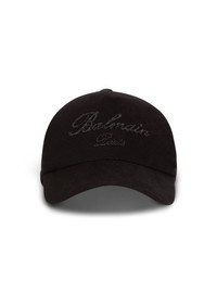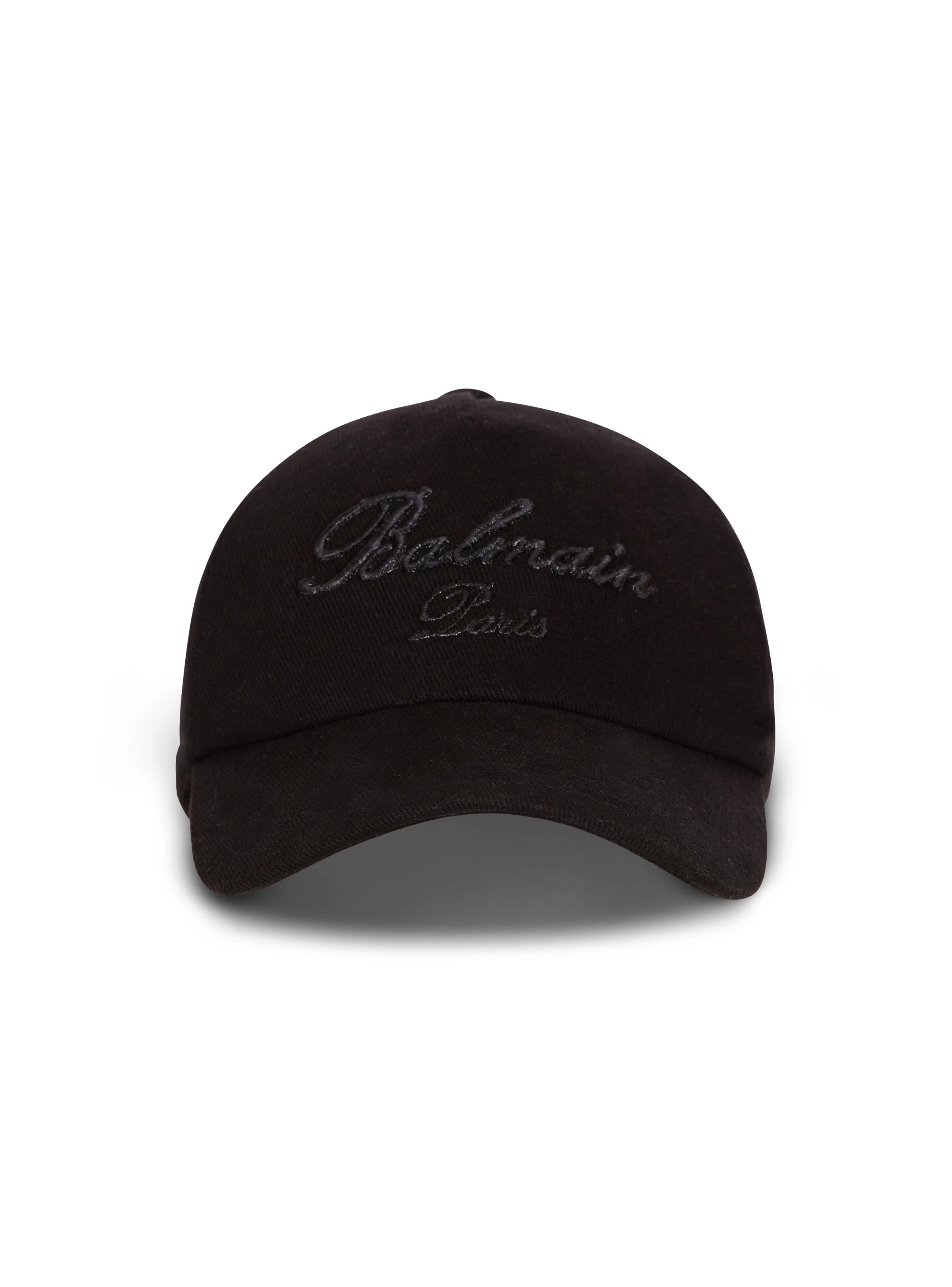 Cotton baseball cap with Balmain Signature embroidery - Balmain Signature tone-on-tone embroidery on the front - Curved visor - Adjustable back strap with engraved silver rectangular metal buckle - Main material: 100% cotton - Made in Bulgaria - Item: DH1XA231CD29
