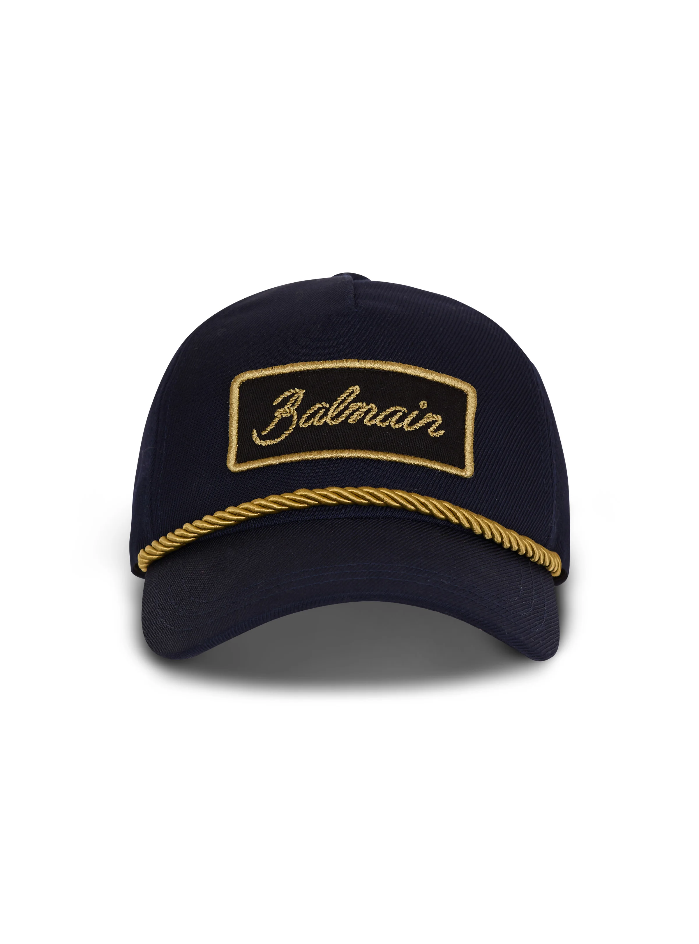 Cotton twill cap with twisted cord - Balmain Signature patch embroidered on the front - Embellished with twisted cord on the front - Curved visor - Adjustable Velcro tab - Cotton lining with Balmain Paris printed ribbons - Main material: 100% virgin wool - Made in Bulgaria - Item: FH1XA475WB02