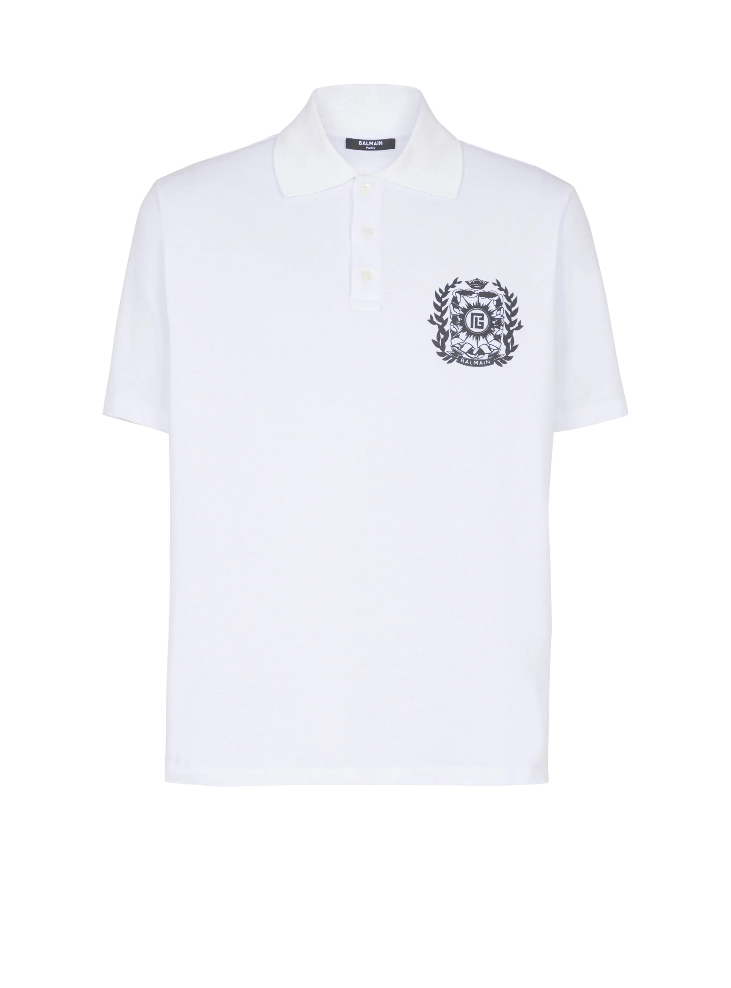 Cotton pique polo shirt with Ecusson print - Ribbed polo collar - Fastening with 3 Balmain-engraved buttons - Short sleeves - Contrasting raised Balmain Ecusson print on the chest - Regular fit - Model measures 190cm and wears a size M - Main material: 100% cotton - Made in Italy - Item: FH1GC035GE96