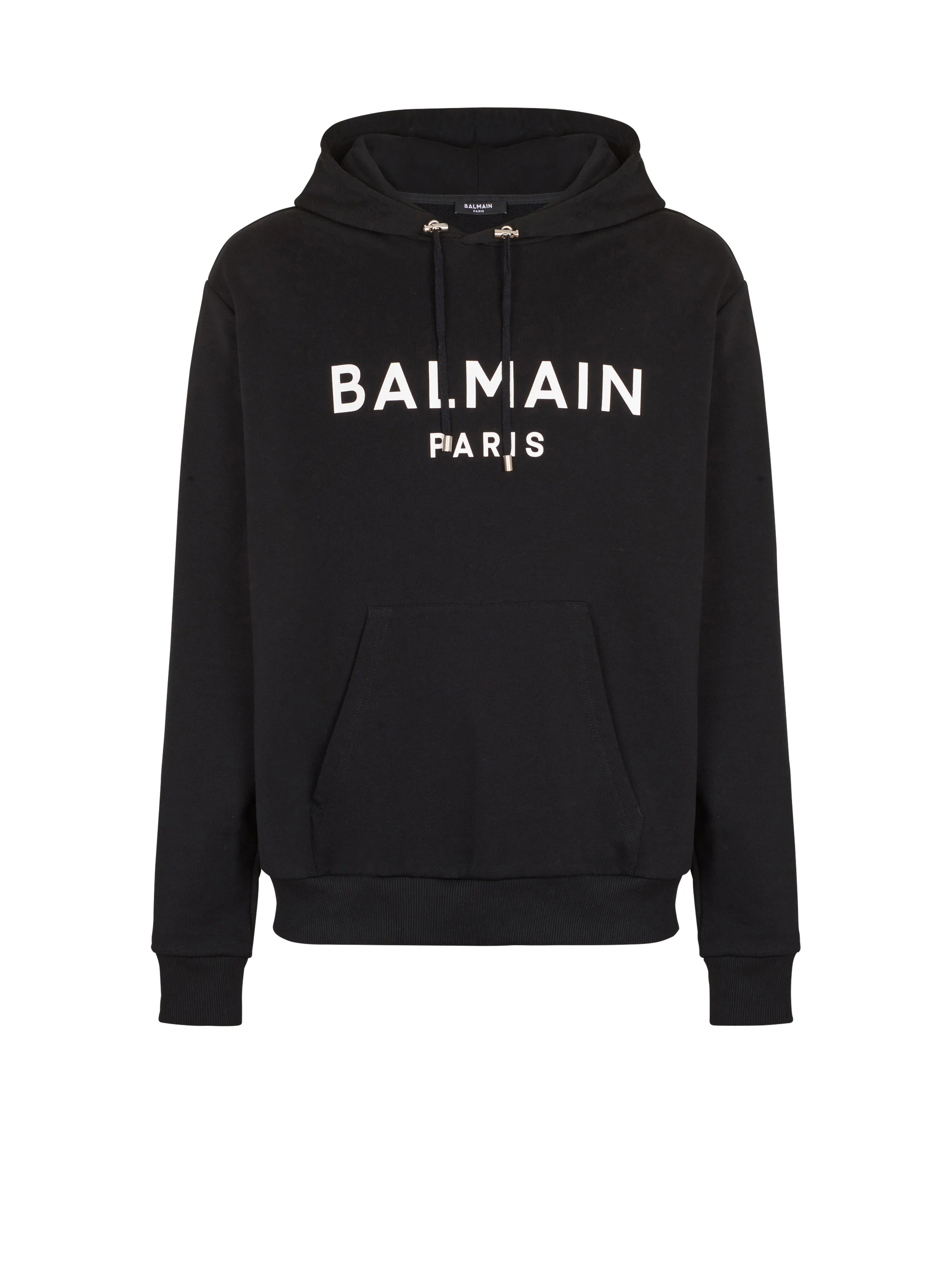 Printed Balmain Paris hoodie - Relaxed fit - Round neck - Drawstring-adjustable hood - Long sleeves - Contrasting Balmain Paris logo printed on the front - Kangaroo pocket - Engraved silver aglets, eyelets and stoppers - Ribbed edging - Model measures 190 cm and wears a size M - Main material: 100% cotton - Made in Portugal - Item: DH1JR002BB65100% of the cotton fibres used to make this garment are certified and organically farmed