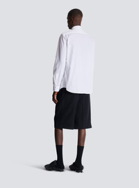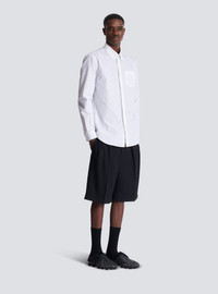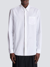 Balmain Ecusson embroidered cotton poplin shirt - Shirt collar - Long sleeves - Straight cuffs with 2 buttons - 1 patch pocket on the chest - Tone-on-tone Balmain Ecusson embroidery on the chest - Fastening with 7 buttons (6 under the placket) - Rounded hem - Straight cut - Model measures 190cm and wears a size 39 - Main material: 100% cotton - Made in Italy - Item: FH1HS480CE48