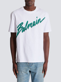 Balmain Lettre flocked T-shirt - Round neck with ribbed trim - Short sleeves - Contrasting printed flocked Balmain Lettre logo on the front - Regular fit - Model measures 190cm and wears a size M - Main material: 100% cotton - Made in Portugal - Item: FH1EG000BC86100% of the cotton fibres used to make this garment are certified and organically farmed