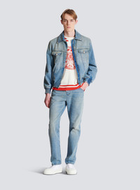Blue lined denim jacket - Shirt collar - Visible metal zip fastening with Balmain Paris-engraved slider - 2 breast pockets with buttoned flaps - “Coin” silver metal buttons - 2 slash side pockets - Long sleeves - Elasticated trim at the cuffs and hem - Inside slash pocket - Printed lining with Chaines pattern - PB and Balmain Paris logos worked into the pattern - Cropped puff cut - Model measures 190cm and wears a size 48 - Main material: 100% cotton - Made in Italy - Item: FH1TC420DF81
