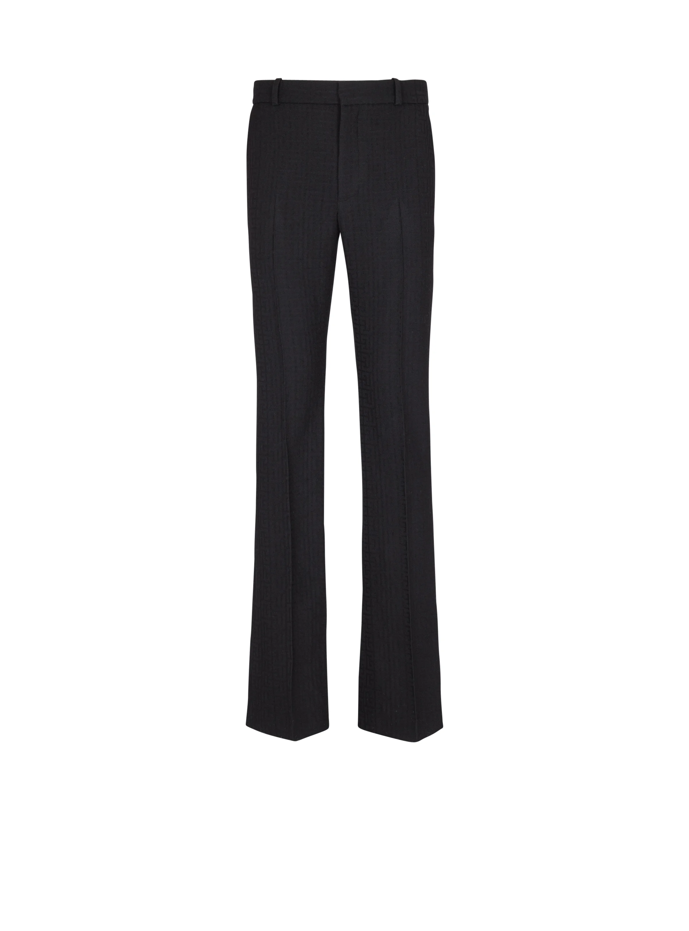 Darted grain de poudre trousers with monogram print - Italian side pockets - Waistband with belt loops - Embroidered Balmain Paris label on the back - Zip fly fastening with button and hook - Regular fit - Model measures 190cm and wears a size 48 - Main material: 100% virgin wool - Made in Portugal - Item: GH1PO120WD54