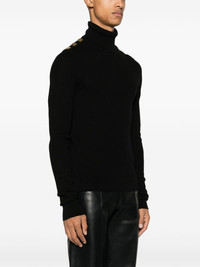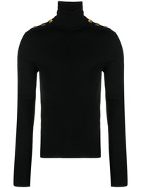 decorative-buttons fine-ribbed wool jumper Highlights - Black - Merino wool - Fine ribbed - Logo-engraved decorative buttons - Gold-tone hardware - Ribbed roll neck - Long raglan sleeves - Straight hem Made in Italy Composition Merino 100% SIZE & FIT Model measurements Height 6 ft 2 in(1.87 m) Bust/Chest 38.18 in(97 cm) Hips 36.61 in(93 cm) Waist 29.13 in(74 cm) FittingInformation Designed for a close fit throughout Made with a midweight knit, this piece offers some stretch This piece fits true to size – take your usual size Washing instructions Dry Clean Only