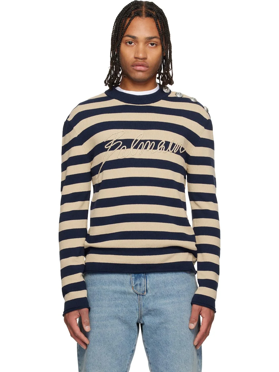 Navy & Beige 'Balmain' Logo Marinière Sweater