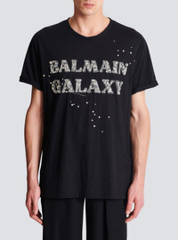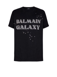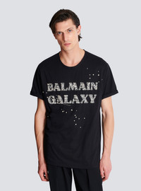 Embroidered Balmain Galaxy T-shirt - Round neck with ribbed trim - Short cuffed sleeves - Balmain Galaxy logo embroidered on the front - Sequin, bead and rhinestone embroidery - Regular fit - Model measures 188cm and wears a size M - Main material: 100% cotton - Made in India - Item: EH0EG136PC76