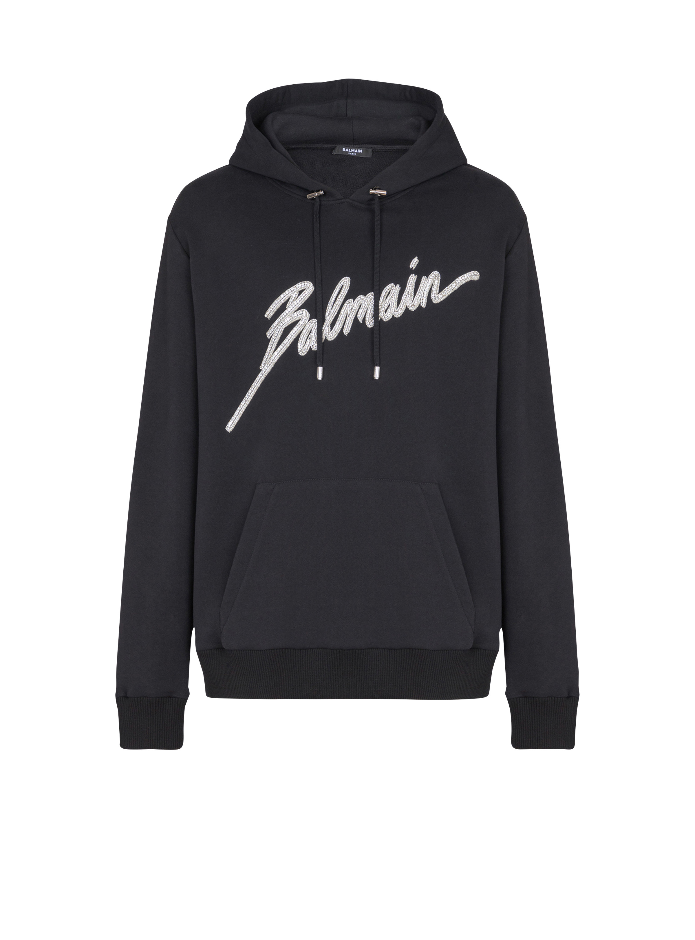 Embroidered Balmain Letter hoodie - Round neckline - Adjustable hood with drawstring - Engraved metal aglets, eyelets and stoppers - Long sleeves - Embroidered Balmain Letter logo on the front - Raised embroidery in crystals and beads - Kangaroo pocket - Ribbed trim - Regular fit - Model measures 186cm and wears a size M - Main material: 100% cotton - Made in India - Item: EH1JT240PC70