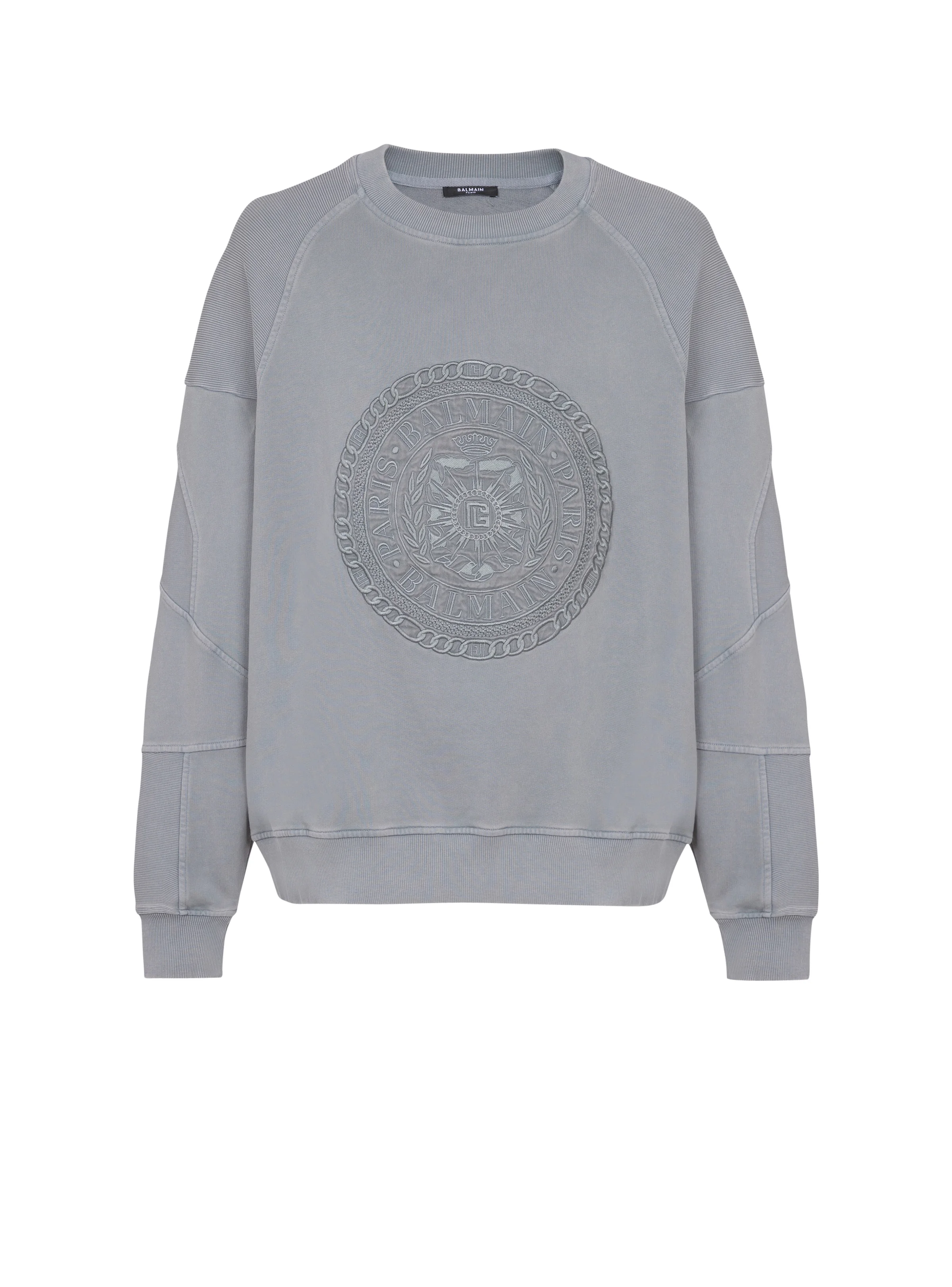 Embroidered Balmain Medaille sweatshirt - Round neckline - Long sleeves - Ribbed inserts - Tone-on-tone Balmain Medaille embroidery on the front - Ribbed trim - Regular fit - Model measures 190cm and wears a size M - Main material: 100% cotton - Made in Portugal - Item: FH1JS013BD08100% of the cotton fibres used to make this garment are certified and organically farmed