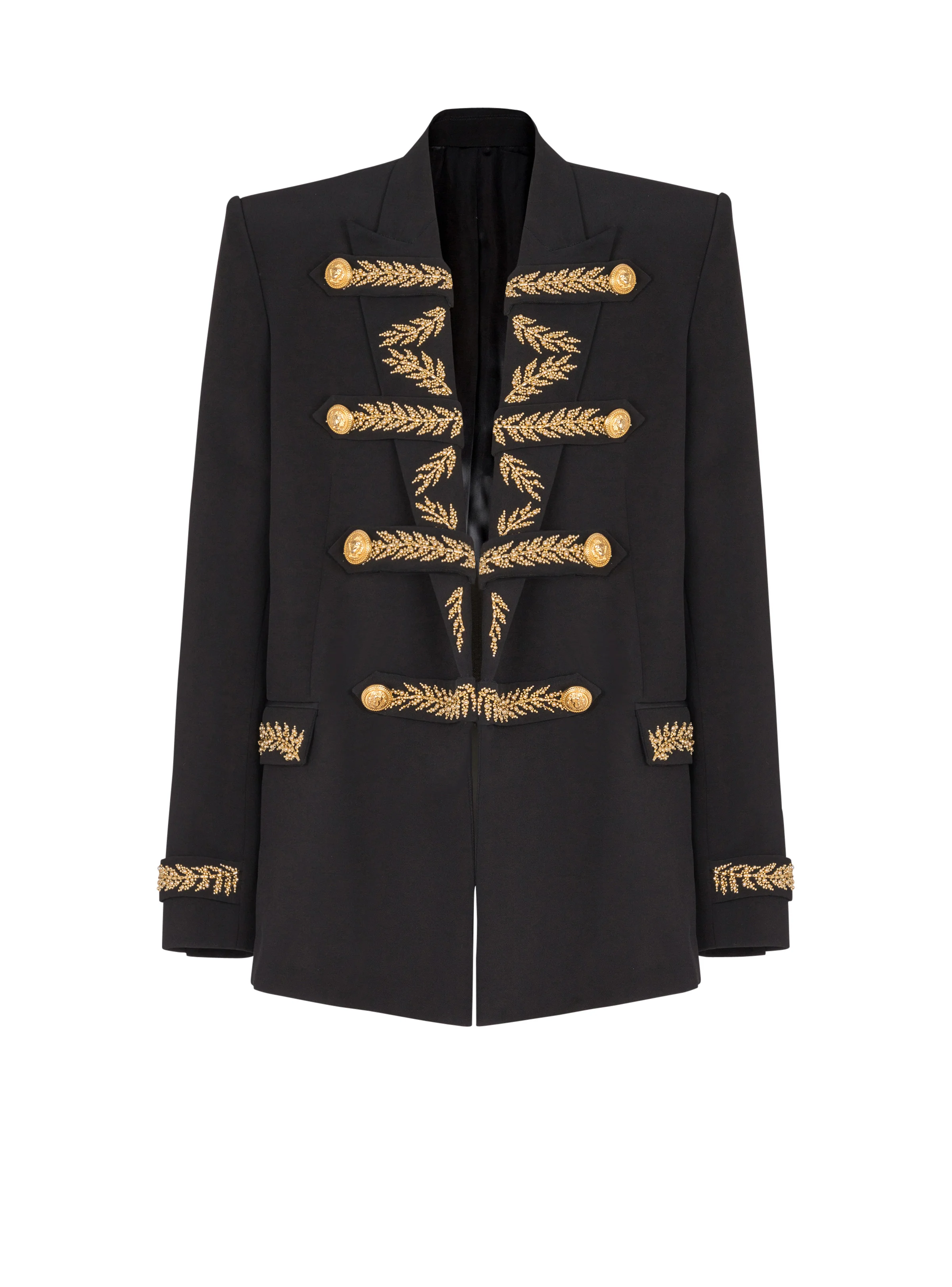 Embroidered crepe jacket - Embroidered Italian tailored collar - Embroidered frogging-style buttoned tabs on the front - Structured shoulders - Long sleeves - Straight cuffs with decorative embroidered tab and button - 2 side slash pockets with embroidered flap - Leaves beaded embroidered pattern - "Chain Lion" buttons in gold metal - Satin lining - 2 slash inside pockets with buttons - Straight cut - Model measures 190cm and wears a size 48 - Main material: 100% viscose - Made in India - Item: FH1SM176PD09100% of the viscose fibres used to make this garment come from certified, sustainably managed forests