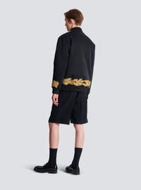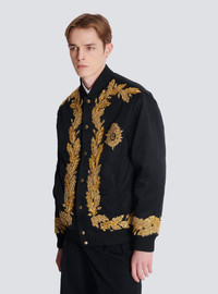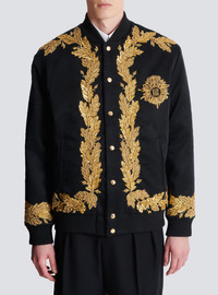 Embroidered cupro bomber jacket - Balmain Ecusson embroidery on the chest - Embroidered trim - Long sleeves - Embroidered cuffs - Golden cannetille, crystal, bead and sequin embroidery - 2 slash side pockets - Front fastening with 7 Balmain-engraved golden press studs - Ribbed trim - Inside slash pocket - Satin lining - Classic fit - Model measures 190cm and wears a size 48 - Main material: 100% cupro - Made in India - Item: FH1TFA75PD09