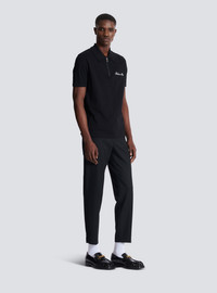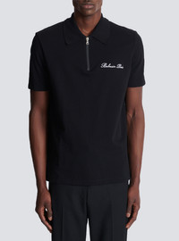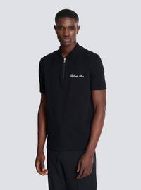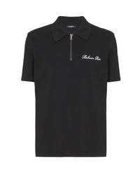 Balmain Signature short-sleeved polo shirt - Straight cut - Ribbed polo collar - Zip fastening, engraved silver metal slider - Short sleeves - Contrasting Balmain Signature embroidery on the front - Model measures 189cm and wears a size M - Main material: 100% cotton - Made in Portugal - Item: DH1GC028BC78