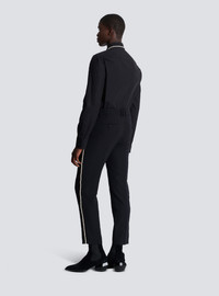 Tailored grain de poudre trousers with "Love Letter" embroidery - Waistband with belt loops and a triple belt loop at the back - Zip, hook and button fastening under a placket - 2 Italian side pockets - Asymmetrical side trim with crystal and cannetille embroidery - 2 slash pockets with buttons on the back - Straight cut - Model measures 190cm and wears a size 48 - Main material: 100% wool - Made in Slovakia - Item: EH1PM08009WC100% of the wool fibres used to make this garment are sourced from sheep farms that are certified and animal welfare-friendly