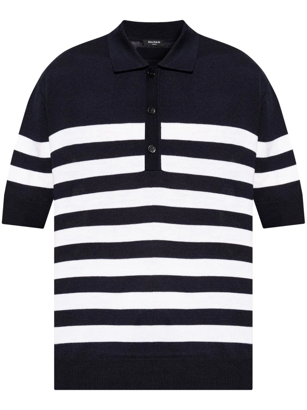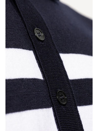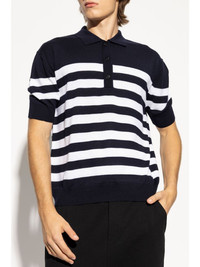 striped polo shirt Highlights - Navy blue/white - Wool - Fine knit - Horizontal stripe pattern - Front button placket - Polo collar - Short sleeves - Logo patch to the rear - Straight hem Made in Italy Composition Wool 100%