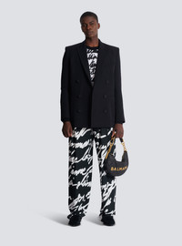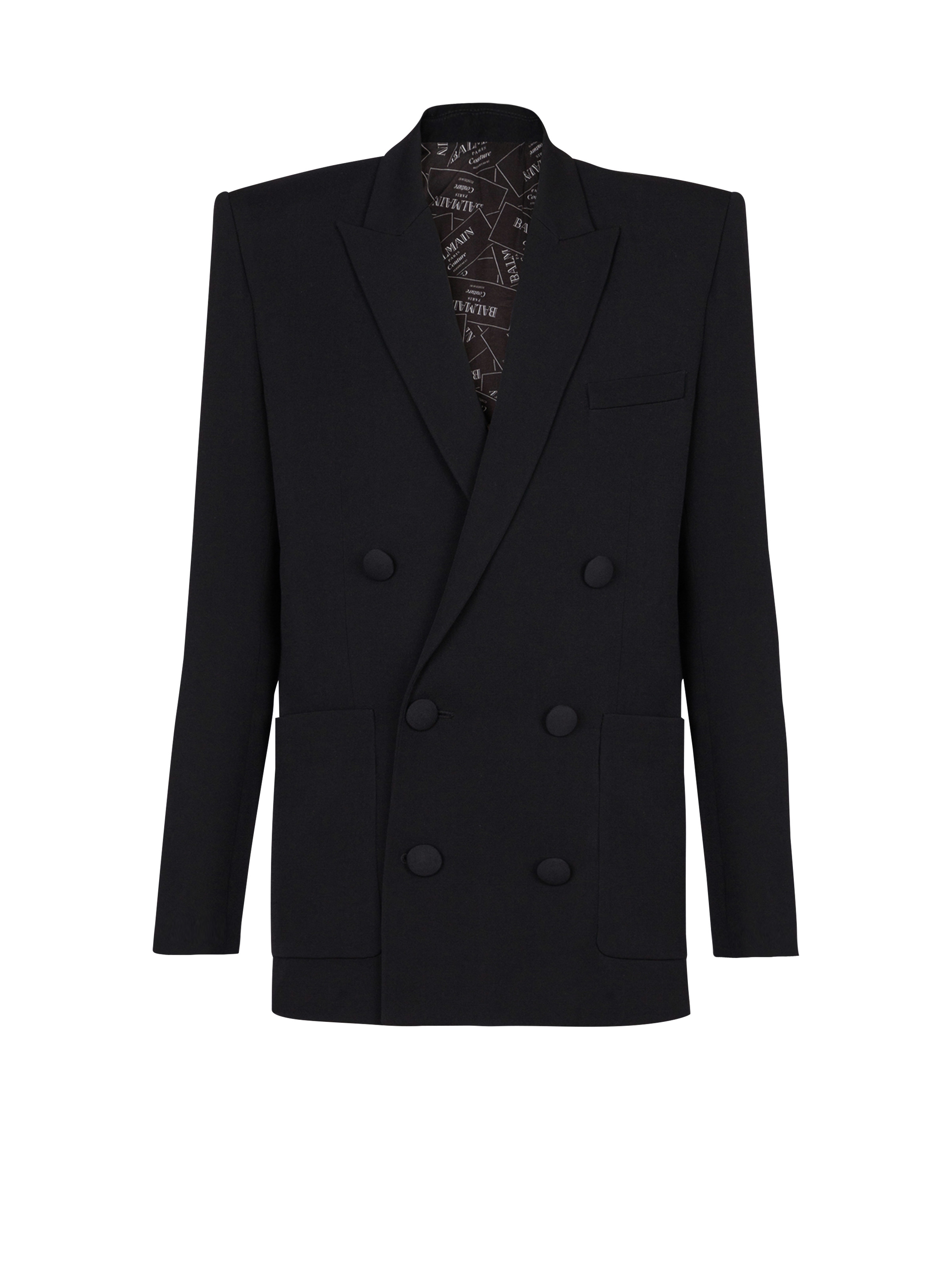 Double-breasted grain de poudre blazer - Italian tailored collar - Structured shoulders - Long sleeves - Straight cuffs with 3 "Double Chain Lion" buttons in gold metal - 1 breast pocket - 2 patch side pockets - Double-breasted fastening with 6 matching covered buttons - Satin lining with Couture label print - Straight cut - Model measures 187cm and wears a size 48 - Main material: 100% wool - Made in Slovakia - Item: EH1SG160WC09100% of the wool fibres used to make this garment are sourced from sheep farms that are certified and animal welfare-friendly