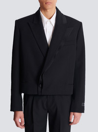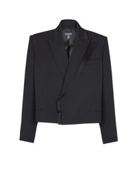 Grain de poudre jacket - Double Italian tailored collar with satin lapels - Long sleeves - Unstructured shoulders - Welt side and breast pockets - Double-breasted fastening with one covered and one hidden button - Cropped, straight cut - Model measures 187cm and wears a size 48 - Main material: 100% virgin wool - Made in France - Item: GH1SC500ME54100% of the wool fibres used to make this garment are sourced from sheep farms that are certified and animal welfare-friendly