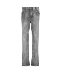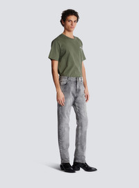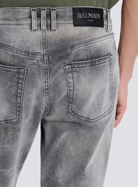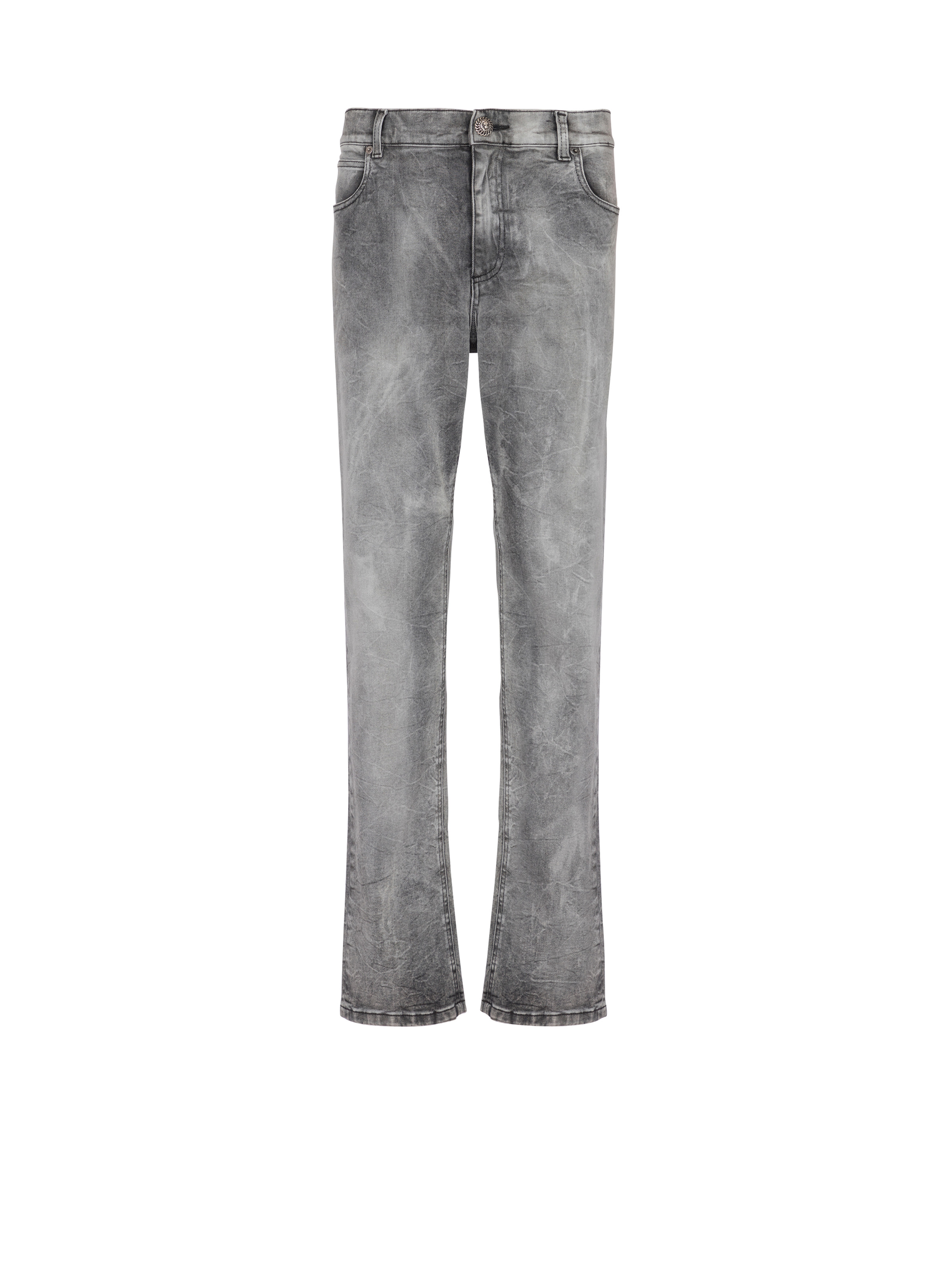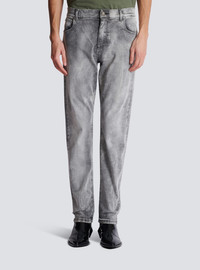 Grey denim regular-fit jeans - Straight cut - 5 classic pockets - Zip fastening with a metal "Double Chain Lion" button - Engraved metal rivets - Waistband with belt loops and a triple belt loop at the back - Woven label with vintage Balmain logo - Silver hardware - Grey wash - Model measures 189 cm and wears a size 30 - Main material: 98% cotton 2% elastane - Made in Italy - Item: DH1MI043DE73