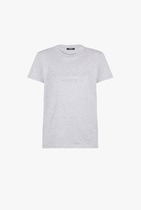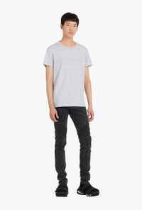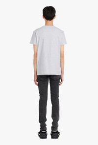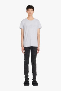Heather gray cotton T-shirt Short sleeves, crew neck, embossed Balmain Paris logo ITEM INFORMATION - Casual cut - Fits true to size, select your usual size - The model is wearing size M - The model's height is 186 cm / 6 ft 1 in, bust 93 cm / 36 in, waist 71 cm / 28 in, hips 89 cm / 35 in - Made in Portugal - Material: 100% Cotton - Item: XH1EF000BB209UB