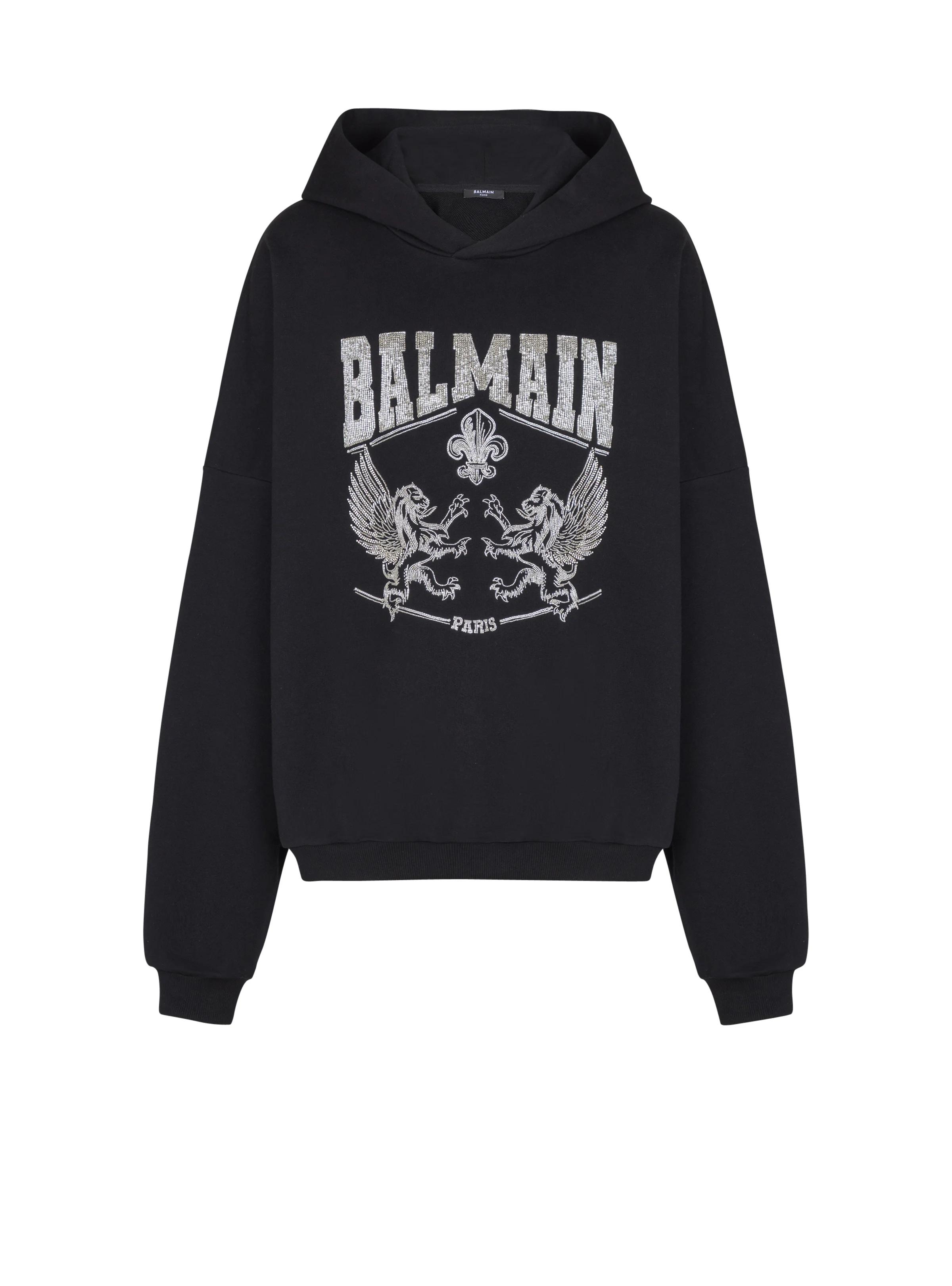 Cotton jersey hoodie - Long sleeves - Adjustable hood with drawstring - Balmain Paris crystal embroidery on the front - Crystal, rhinestone and bead embroidery - Relaxed fit - Model measures 189cm and wears a size M - Main material: 100% cotton - Made in India - Item: GH1JT251PD33100% of the cotton fibres used to make this garment are certified and organically farmed