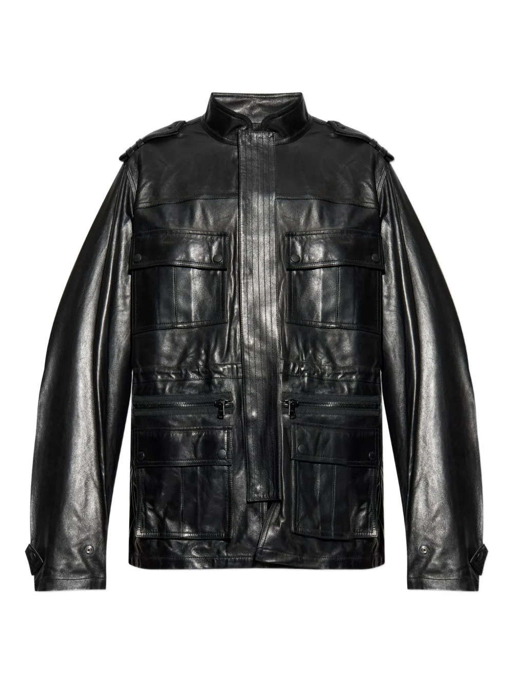 multiple-pocket leather jacket Highlights - Black - Lambskin leather - Multiple pockets - Central zip fastening - Buttoned cuffs - Stand collar Imported Composition Lamb Skin 100% Washing instructions Read Manufacturer Guidelines