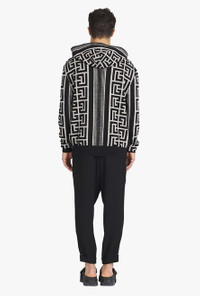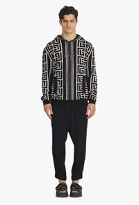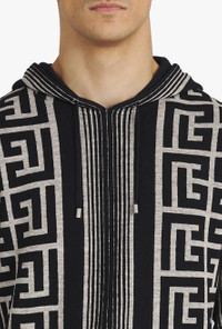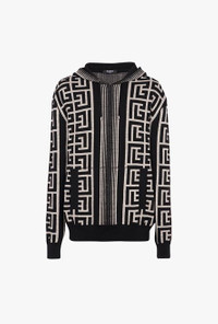 Ivory and black wool sweater Long sleeves, ribbing, drawstring hood, Balmain monogram print ITEM INFORMATION - Fitted cut - Fits true to size, select your usual size - The model is wearing size M - The model's height is 189 cm / 6 ft 2 in, bust 89 cm / 35 in, waist 75 cm / 29.5 in, hips 89 cm / 35 in - Made in Italy - Material: 50% Wool, 40% Linen, 5% Polyamide - Item: XH1JR070KB34GFE